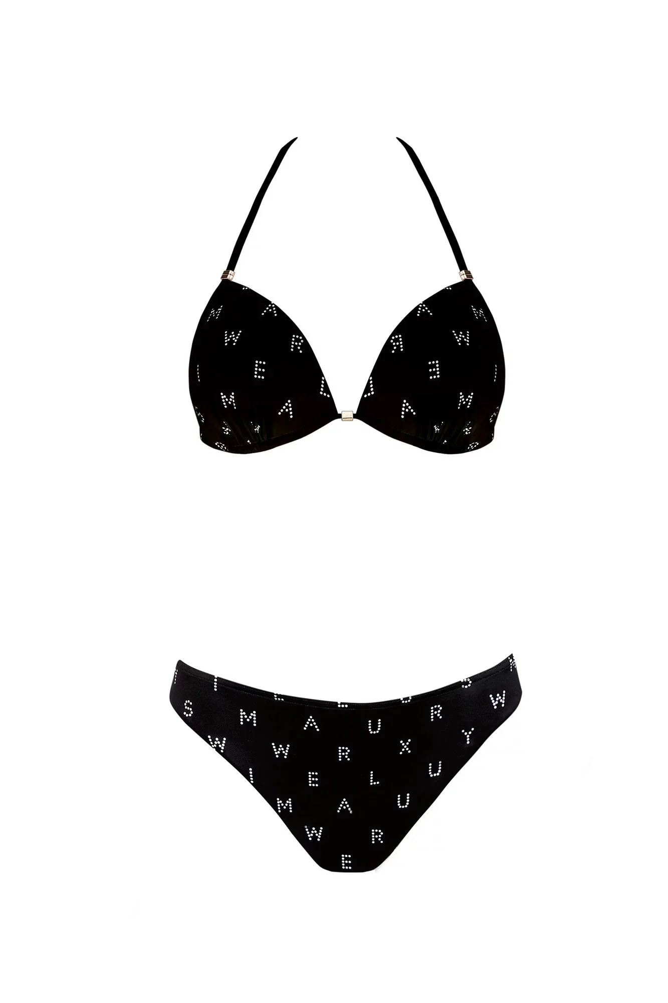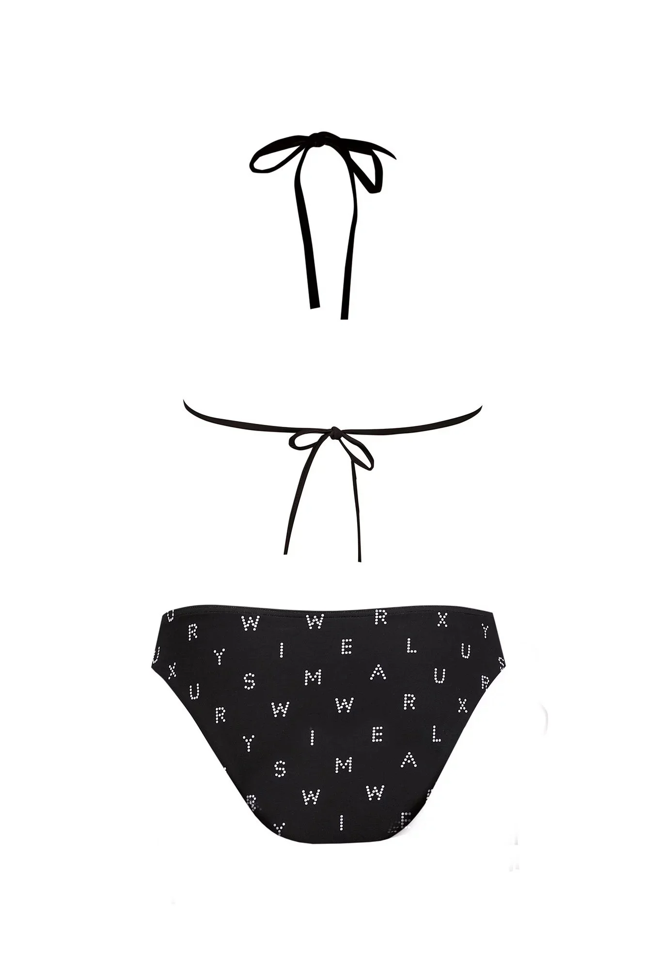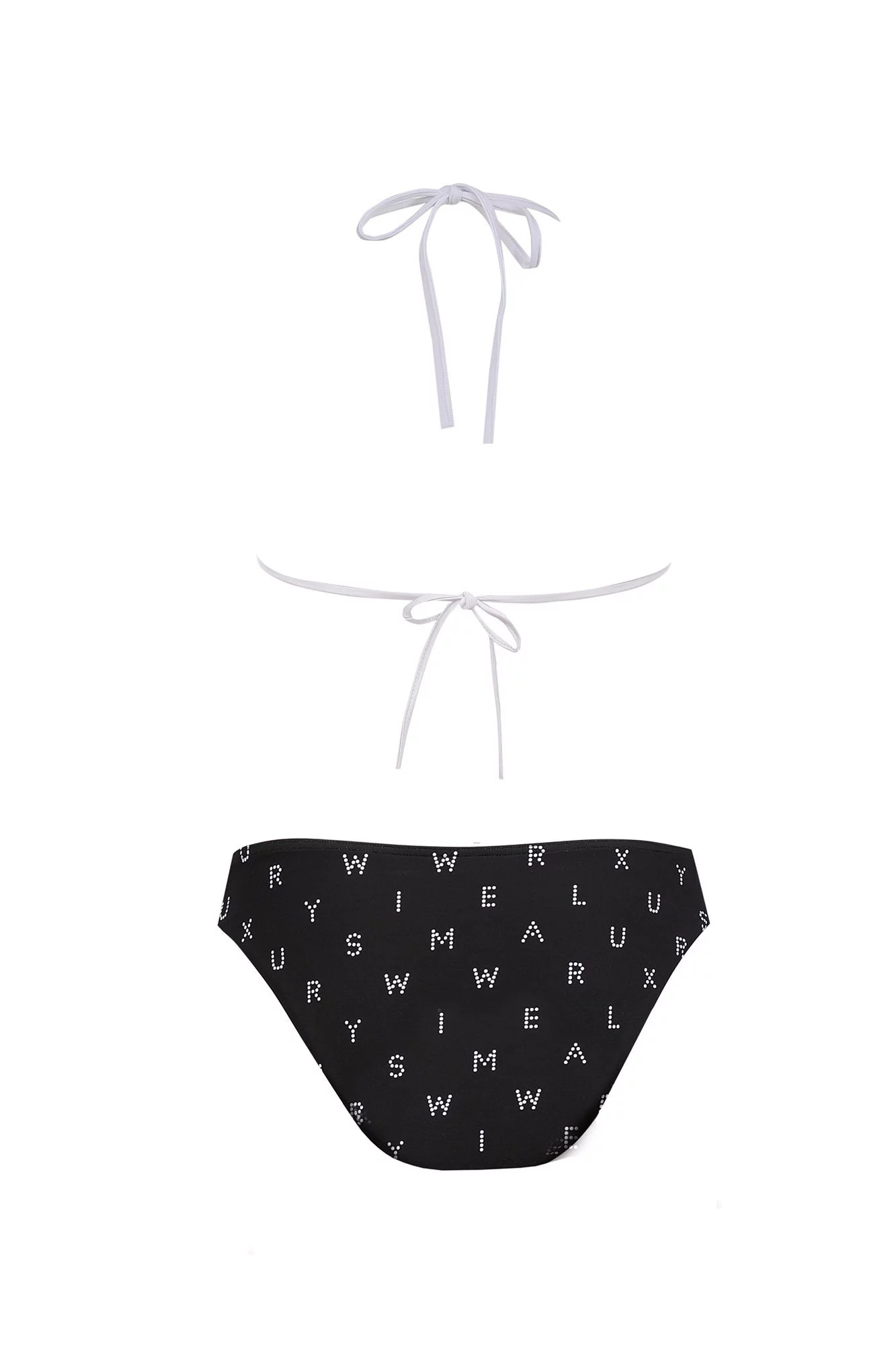 Dvoudílné dámské plavky, vrchní díl mírně vyztužený, bez kostice, spodní část podprsenky na posouvání. Vzadu na zavazování za krem a na zádech.