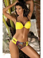 Výjimečné plavky pro ženy, které rády drží krok s plážovou módou. Dvoudílný komplet se senzační podprsenkou, kterou zdobí dvě tenká, přídavná ramínka - "gumičky". Zvýrazní váš nový, profesionálně vymodelovaný dekolt. Podprsenka s vyztuženými košíčky, kosticemi a push up košíčky - dokonale sbírá ňadra, nadzvedává je a vytlačuje nahoru. Nastavitelná ramínka bez ramínek, pohodlné zadní zapínání na přezku. Součástí kompletu jsou kalhotky, s bočními průstřihy (velmi módní), vzorované (vpředu i vzadu). Skvěle doplňují krásné, šťavnaté barvy podprsenky.