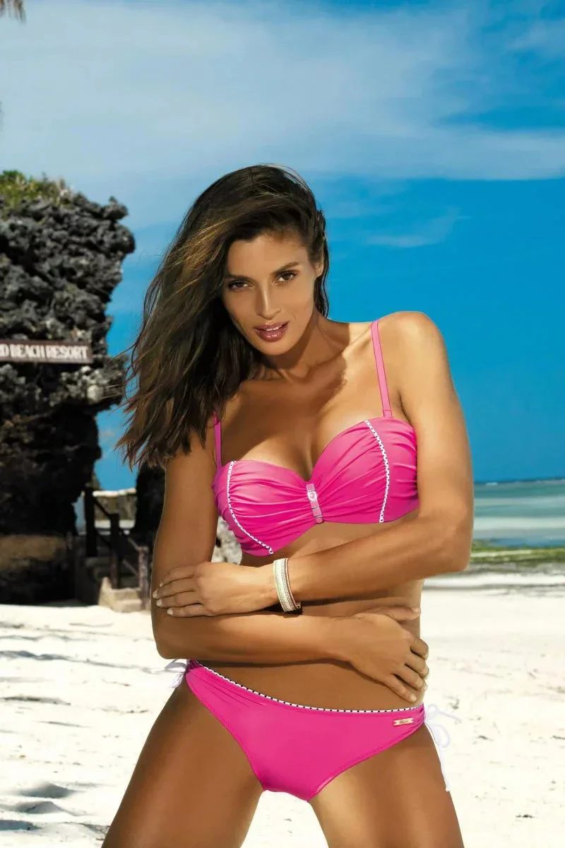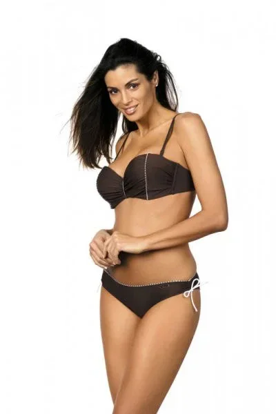 Stylové dvoudílné plavky, které využijete jak při plavání, tak při opalování.Podprsenka je ušitá ve stylu bardotky. Košíčky jsou vyztužené. Mezi košíčky je umístěná ozdobná stříbrná vsadka, kterou je možné vyjmout. Podprsenka je doplněná o svislé boční kostice a vzadu se zapíná na pohodlný klip. Ramínka je možné nastavit i odepnout.Kalhotky jsou klasické, hladké a ozdobené puntíkovanou lemovkou. Na bocích jsou nastavitelné popruhy.Plavky jsou rychleschnoucí a odolávají působení slunečního svitu (neblednou a nevytahují se).Model je vyrobený z velmi kvalitní italské látky Carvico Tesutti.