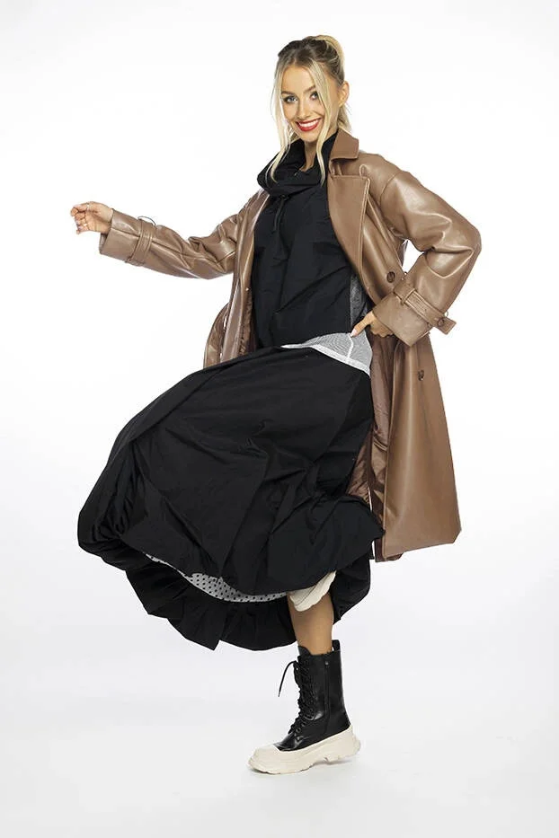 Kabát má podšívku, pásek pro zavazování, dvě kapsy a zapíná se knoflíky. Ve spodní části modelu je vzadu rozparek. Model má délku ke kolenům.