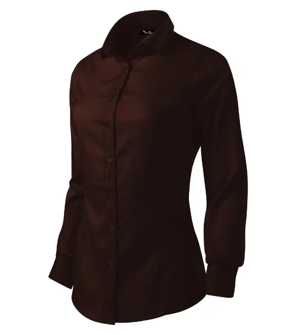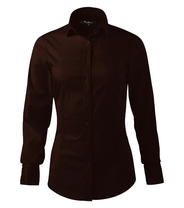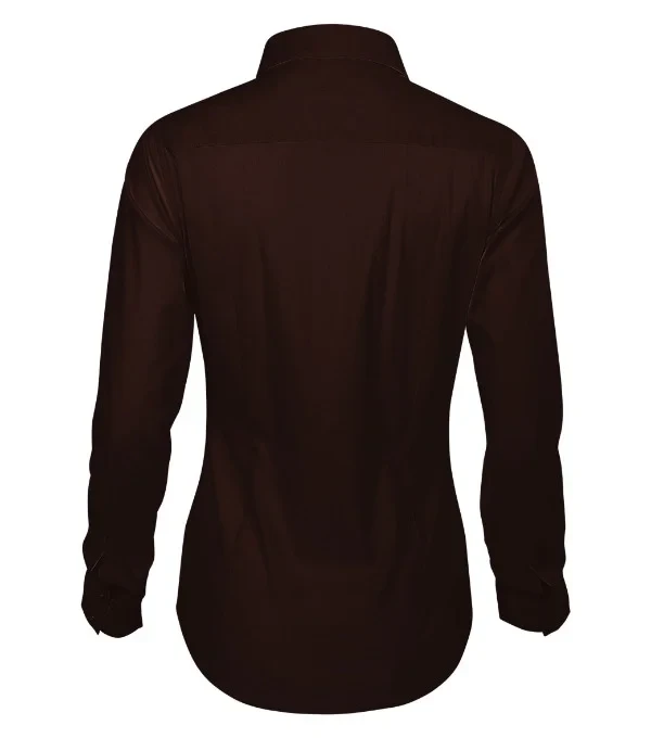 jemný strečový materiál projmutý střih s bočními švy dvojité sedlo na zadním dílu pasové a prsní záševky dvoudílný košilový límec přední kraje začištěny légou dlouhé rukávy s šikmou manžetou na 2 knoflíčky perleťové knoflíčky v barvě materiálu (1 náhradní navíc) tvarovaný dolní kraj