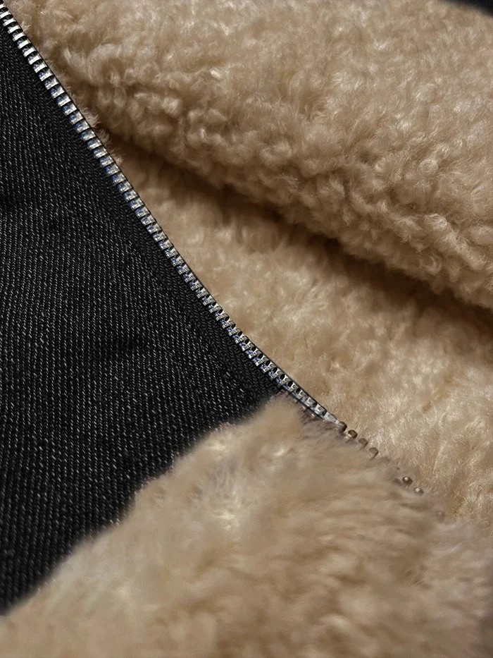 Bunda má volný střih, uvnitř má kožešinovou podšívku, má také kožešinový límec a dvě kapsy a zapíná se stříbrným zipem. Rukávy jsou lehce zateplené syntetickou péřovou výplní. Model má délku do pasu.