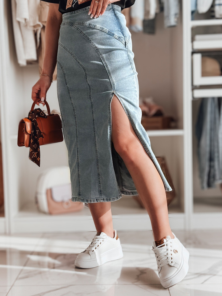 Dámská džínová midi sukně s vysokým pasem je skvělým základem pro styling pro každou příležitost. Asymetrické prošívání jí dodává originalitu a rozparek na boku zvýrazňuje siluetu. Model má boční zapínání na zip a je vyroben z materiálu, který se přizpůsobí postavě. Ideální volba pro každodenní nošení i výjimečnější příležitosti.