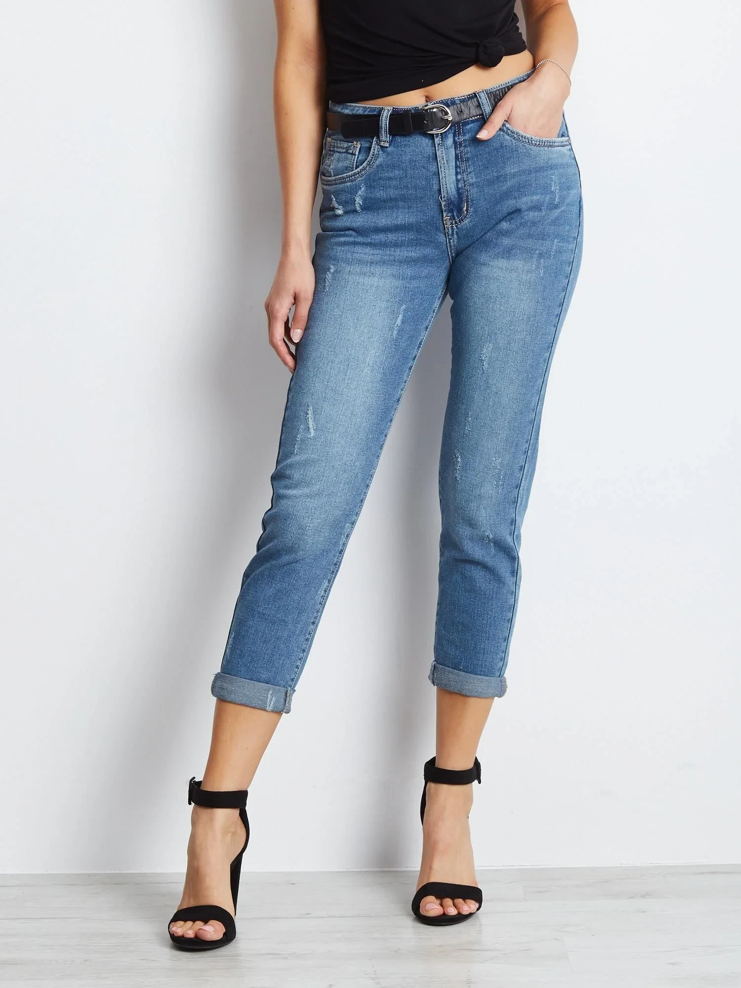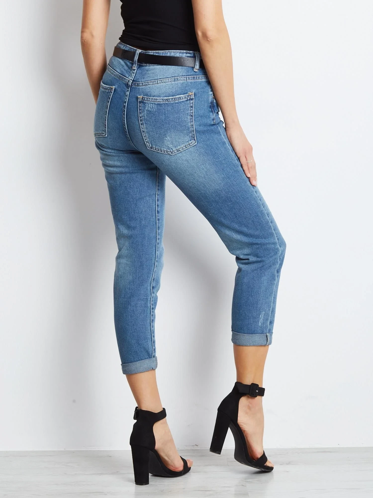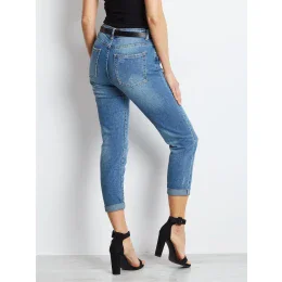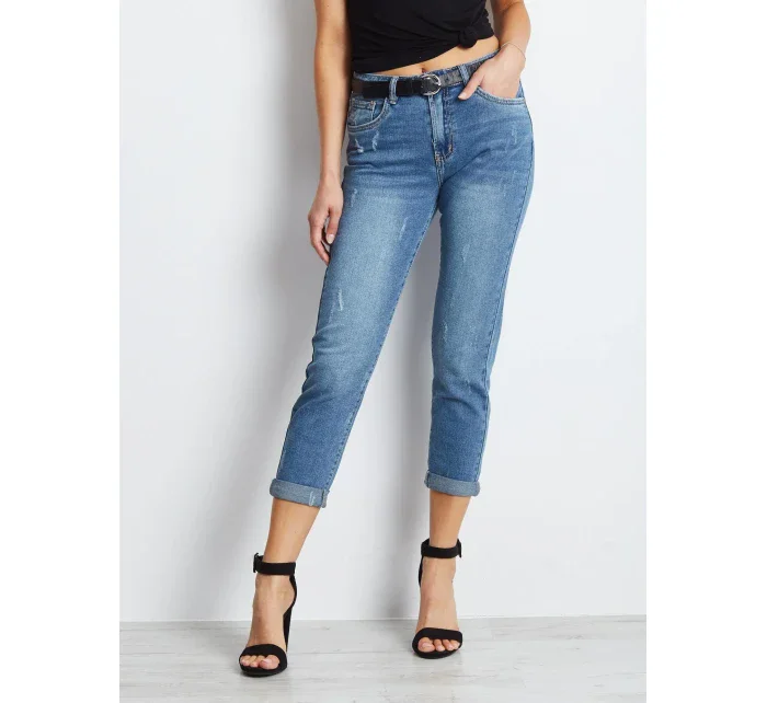 Vypasované džíny s tmavě modrým lemováním.