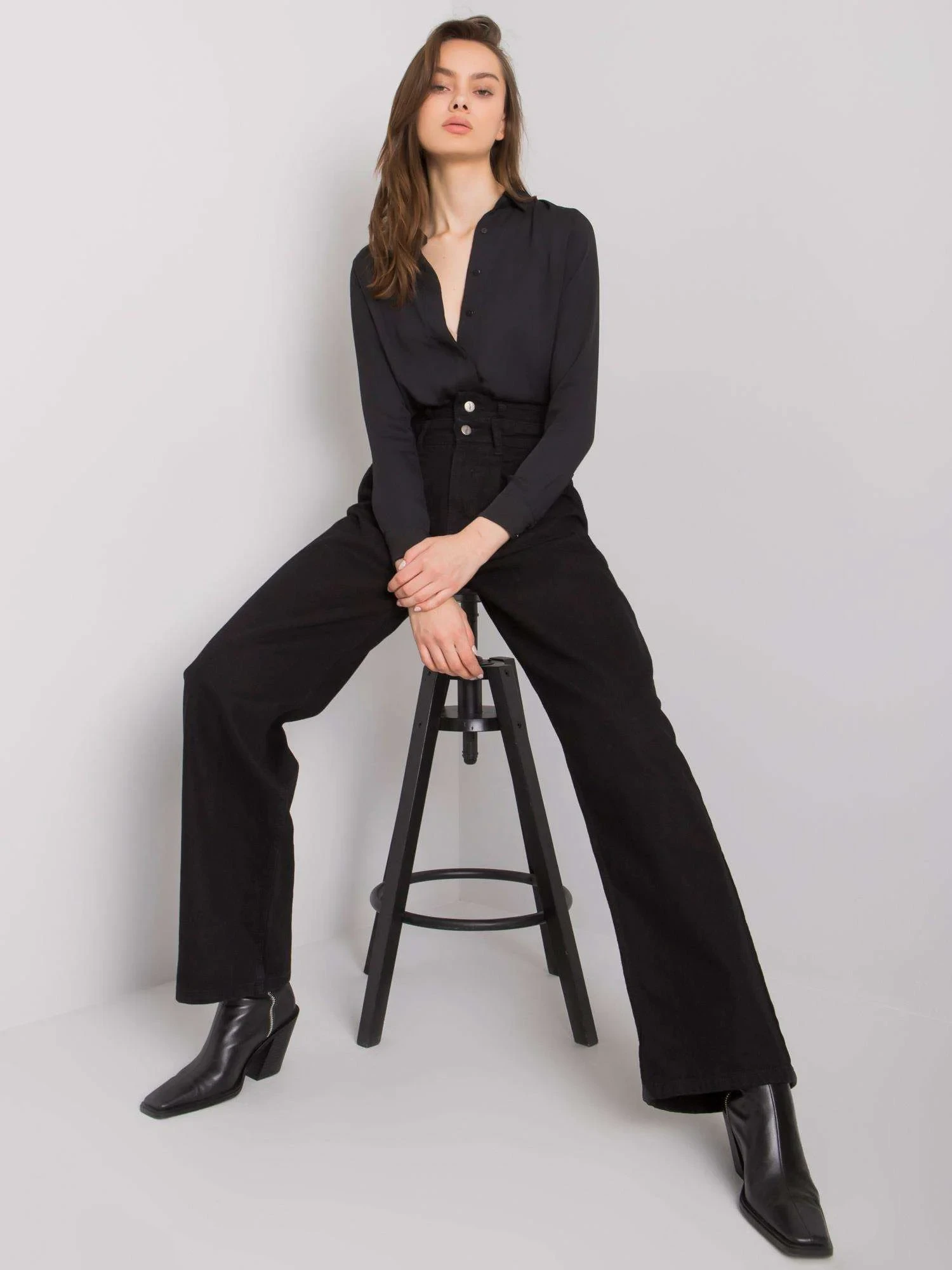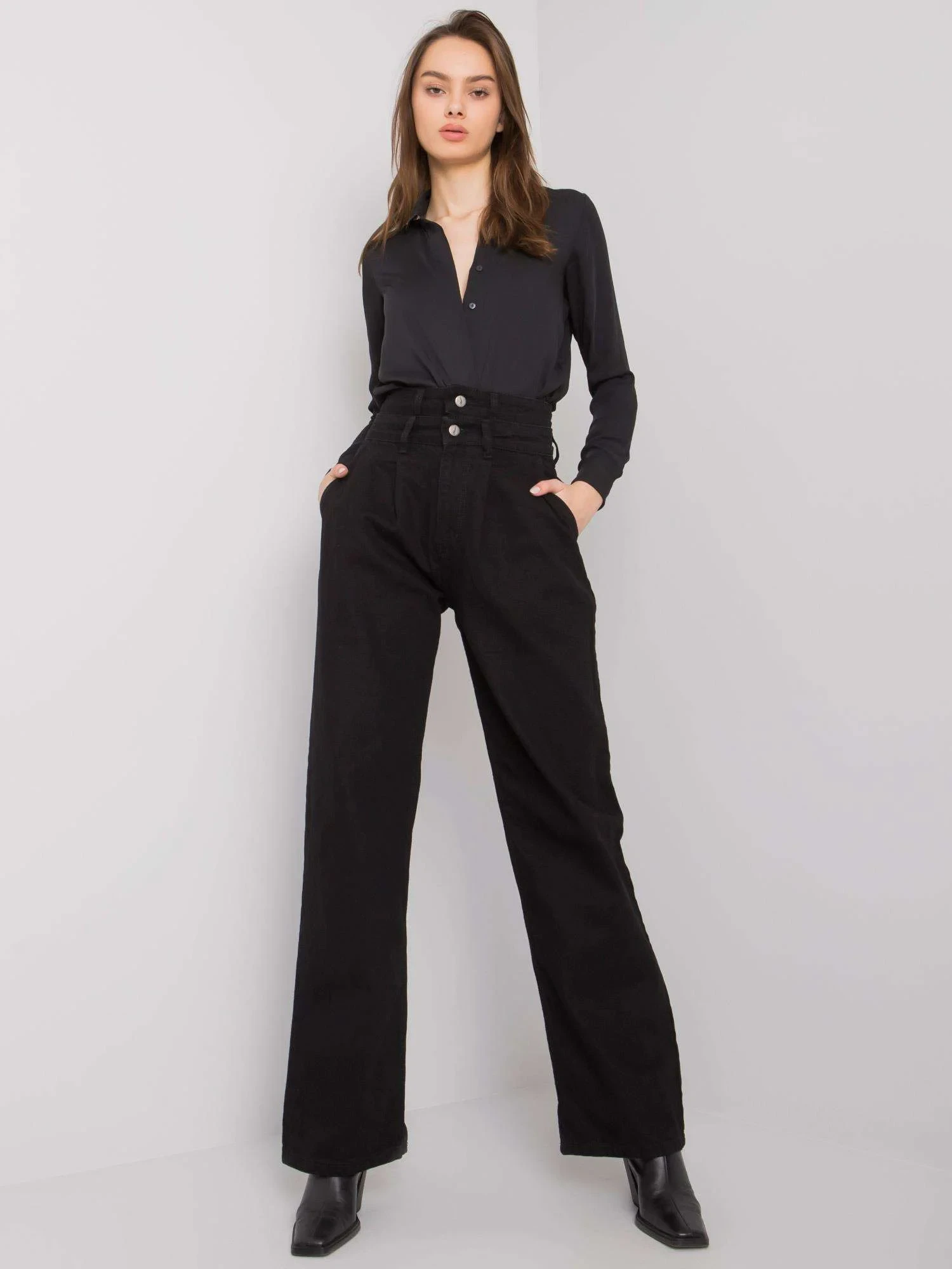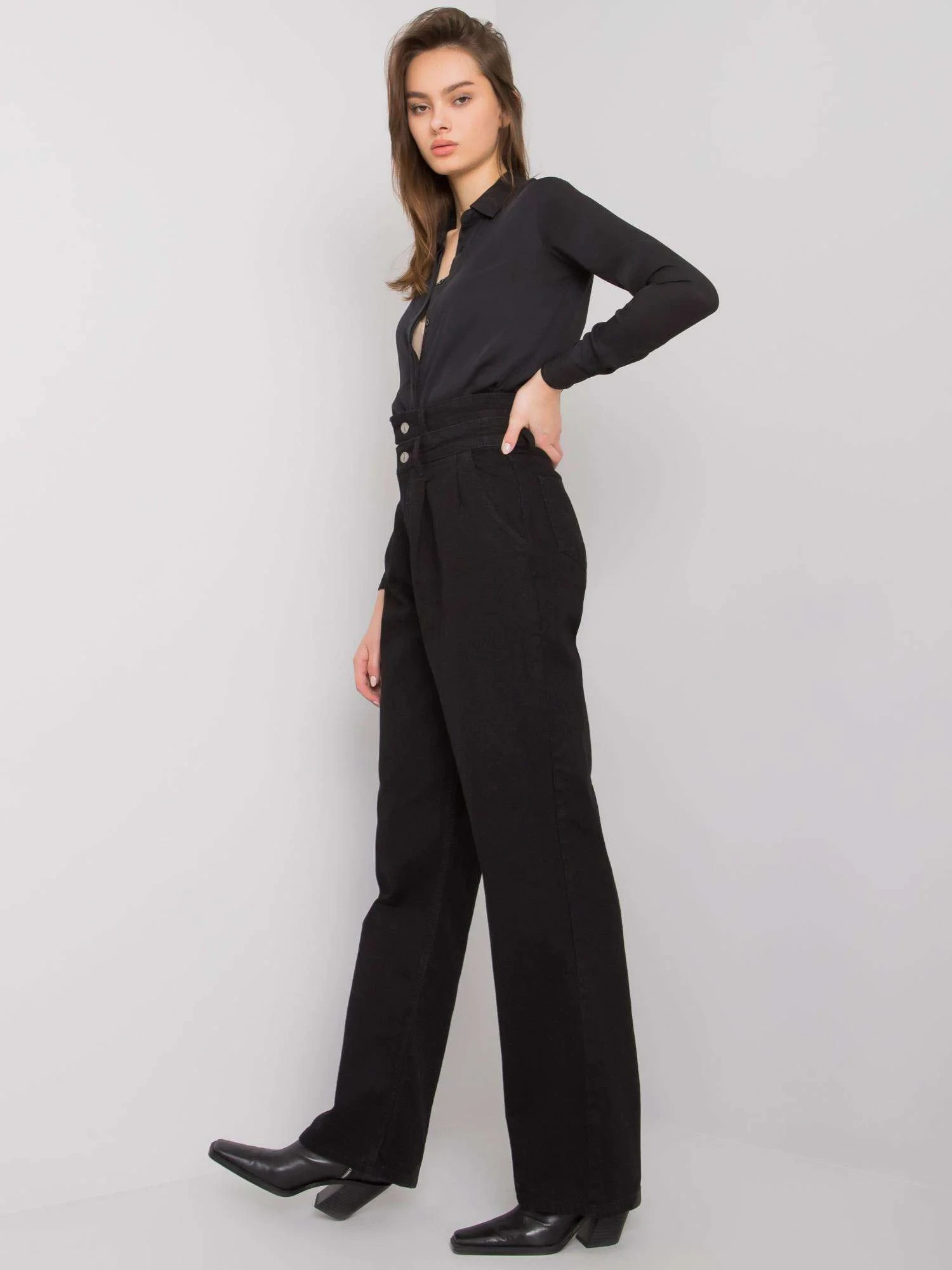 Černé široké džíny s vysokým pasem .
