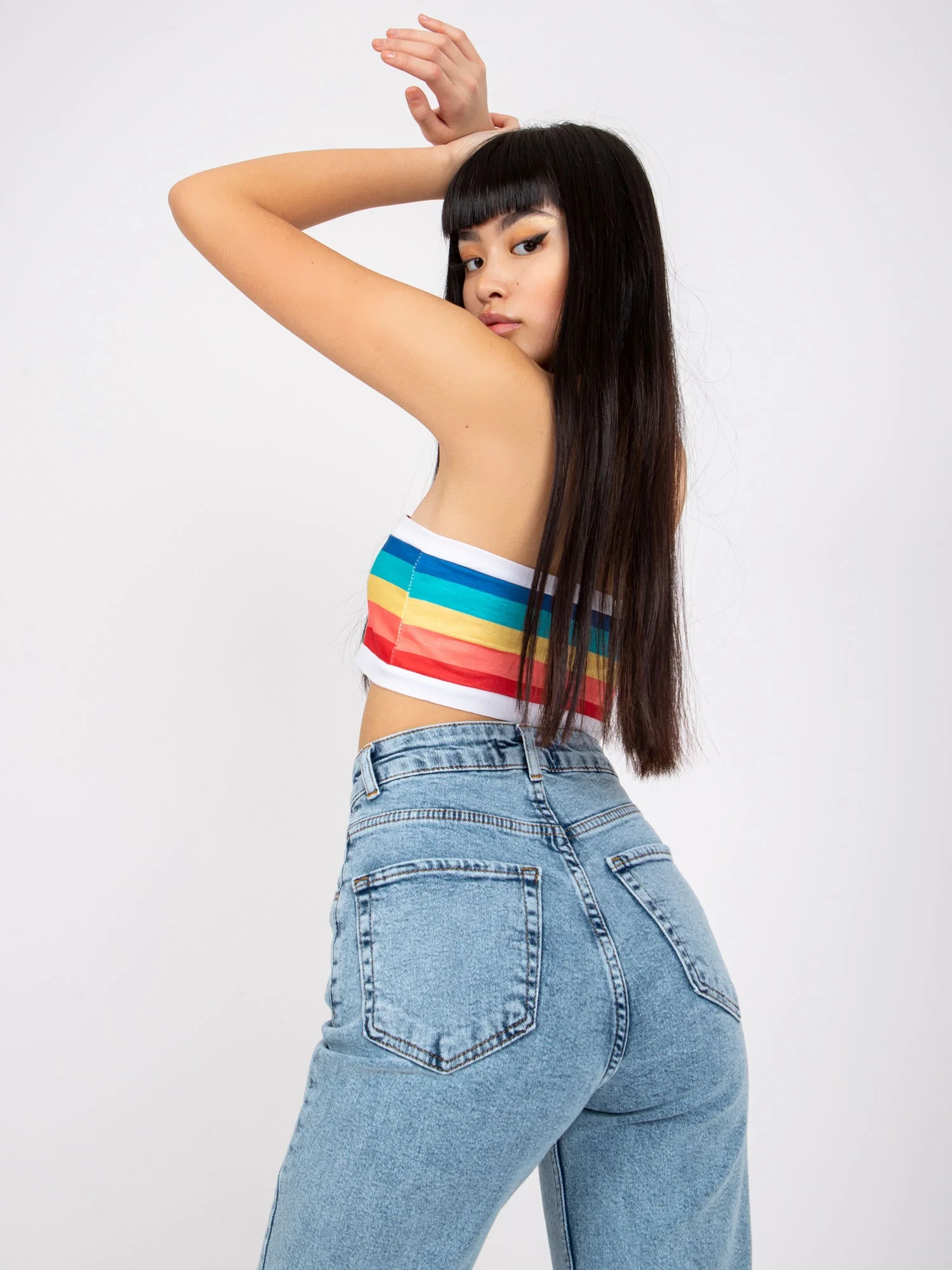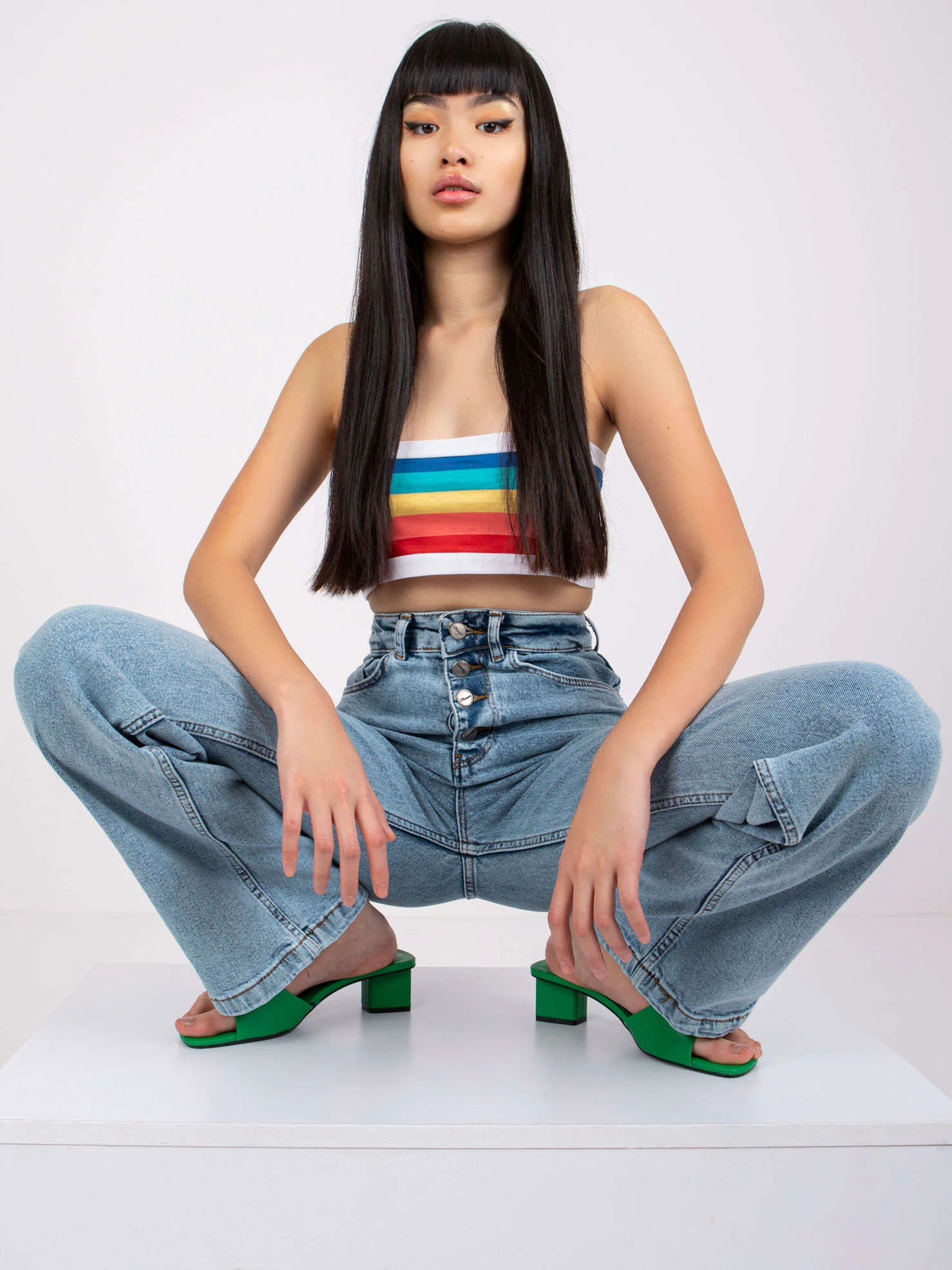 Modelka má na sobě velikost 27. Rozměry modelky: výška 175 cm, poprsí 84 cm, pas 62 cm, boky 93 cm.