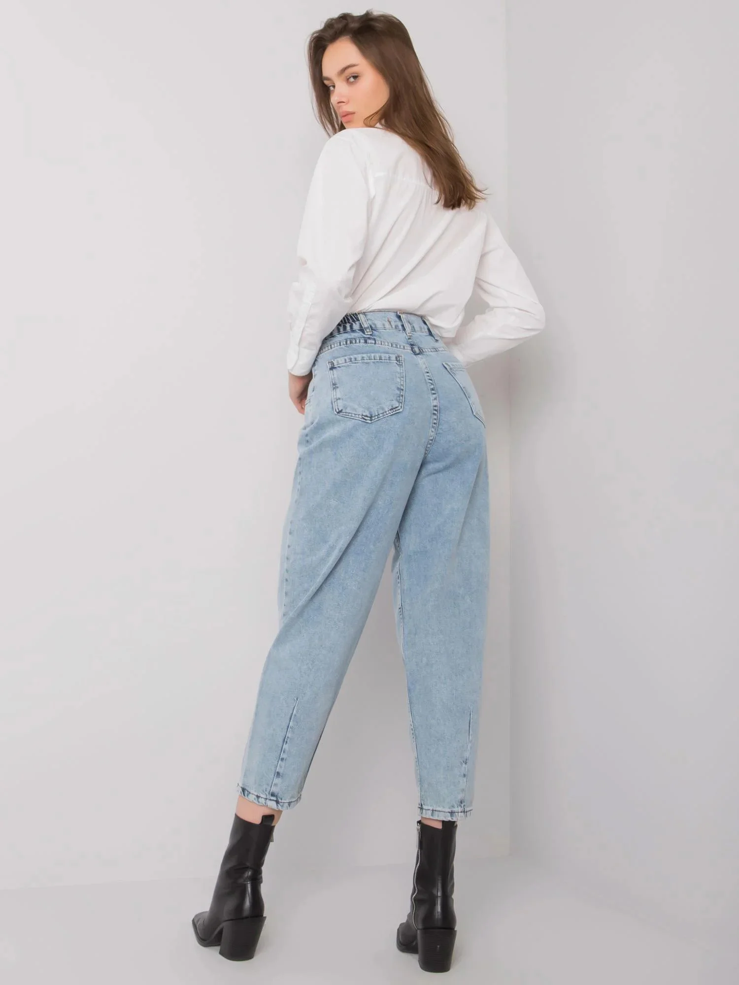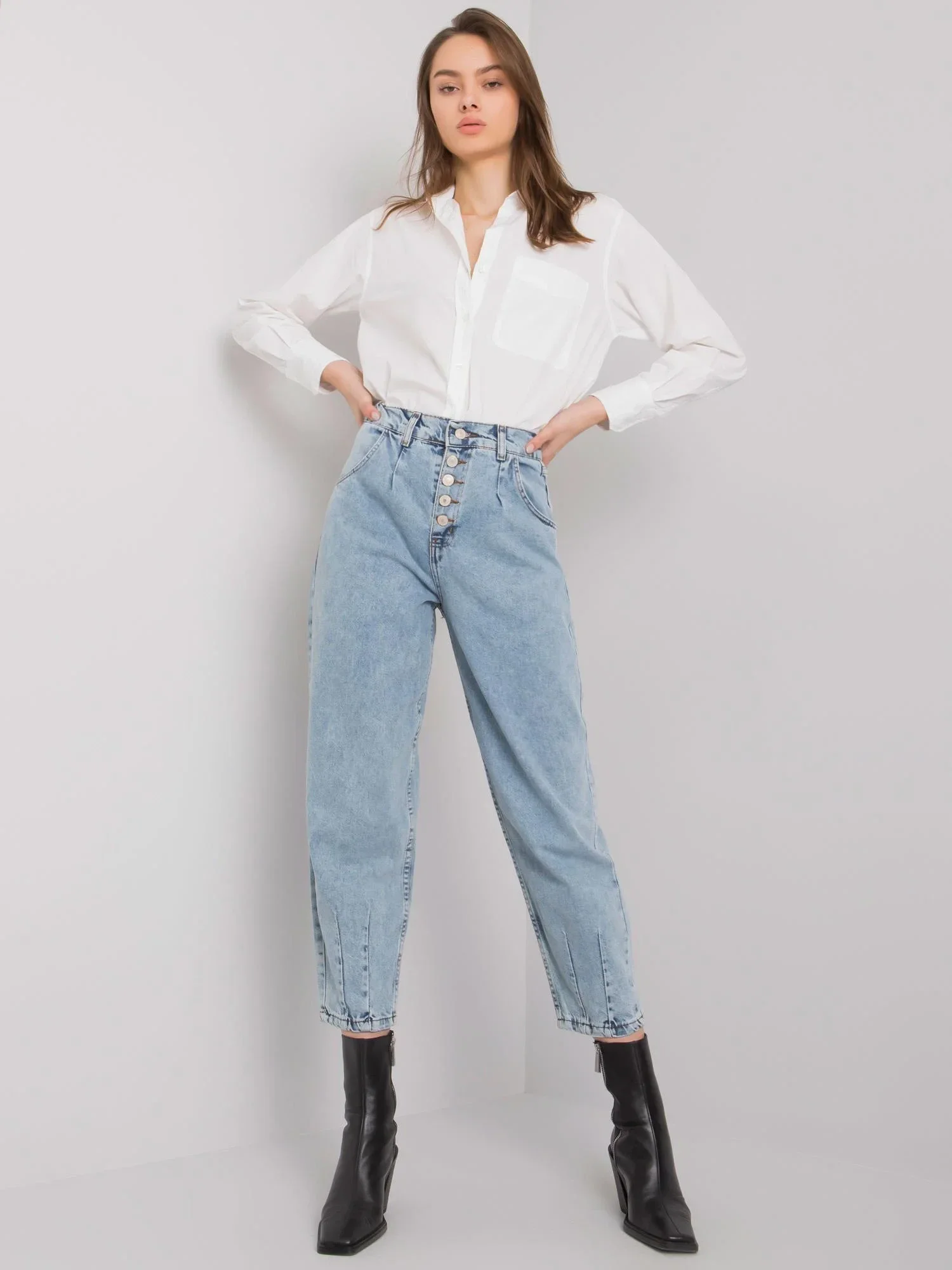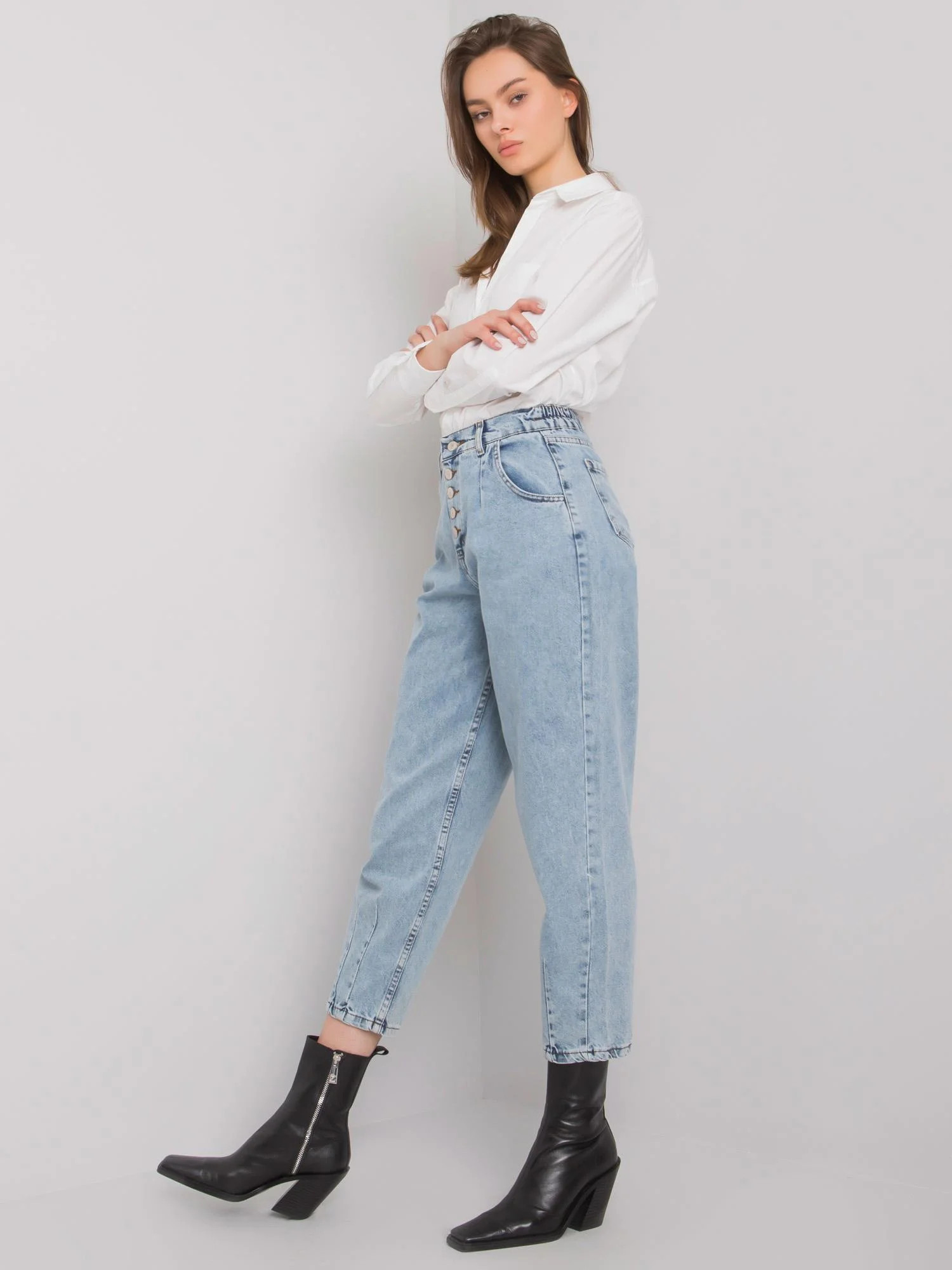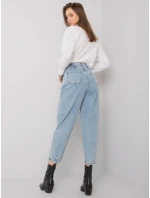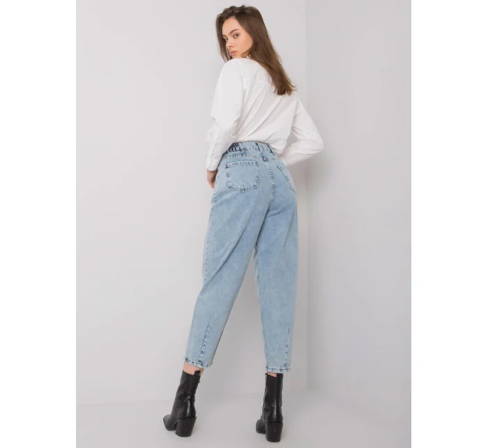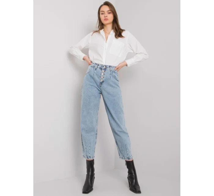Modré džínové kalhoty pro maminky s knoflíky.