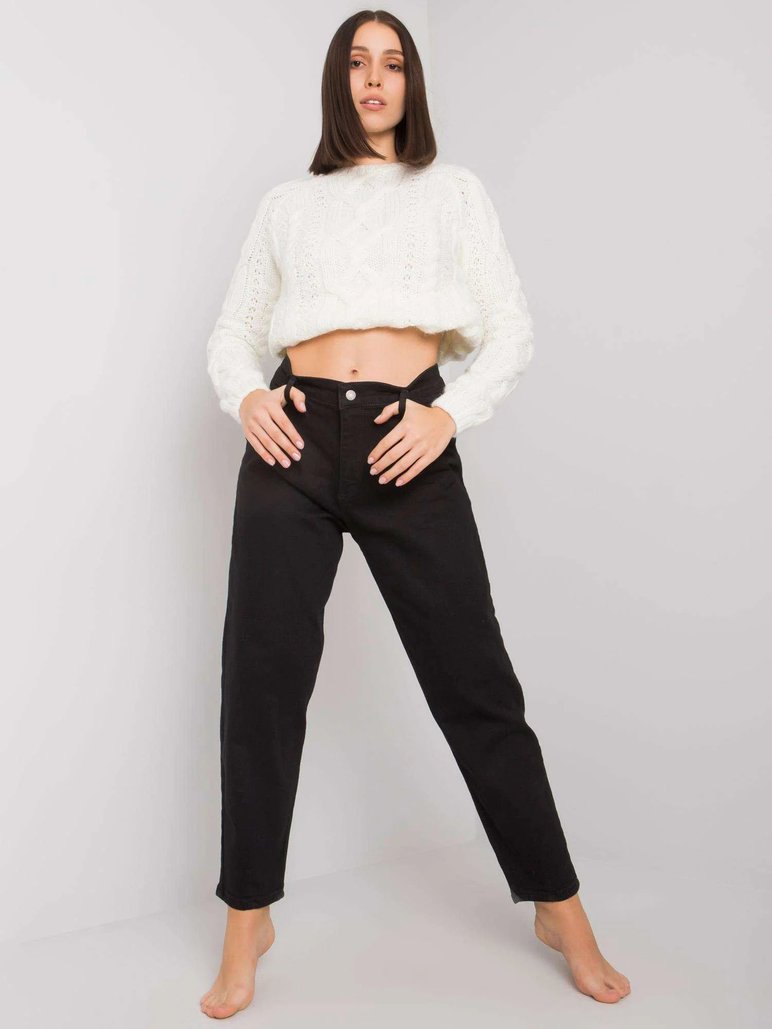 Modelka ma na sobie rozmiar 31. Wymiary modelki: wzrost 175 cm, biust 90 cm, talia 67 cm, biodra 103 cm.