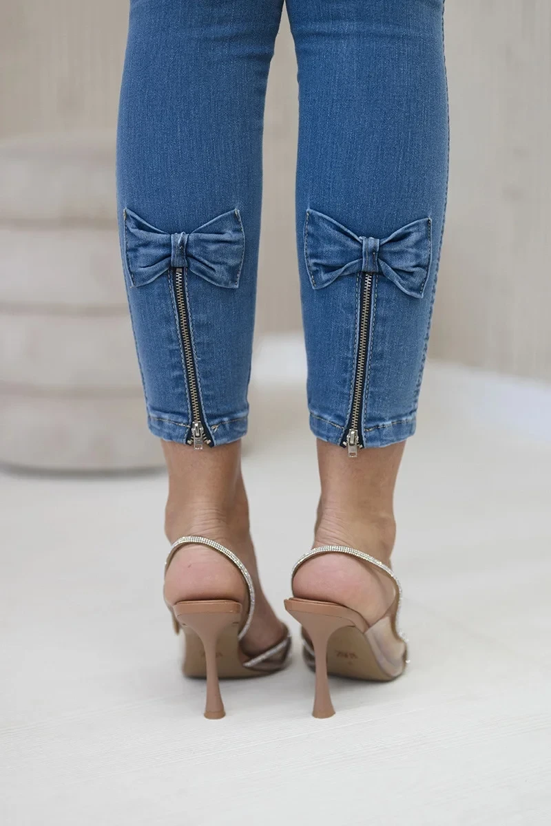 Džíny s mašlí jsou roztomilým a módním doplňkem každodenního šatníku. Vyrobené z vysoce kvalitního denimu, poskytují pohodlí a odolnost. Jemná mašle jim dodává jemný, ženský charakter, díky čemuž se odlišují od klasických modelů. Perfektně se hodí jak k ležérním tričkům, tak k elegantním halenkám, což vytváří outfity pro různé příležitosti. Je to skvělá volba pro ty, kteří si cení klasiky s nádechem originality. Kalhoty jsou vyrobené z vysoce kvalitního materiálu a jsou k dispozici ve velikostech: S, M, L, XL, 2XL, 3XL.