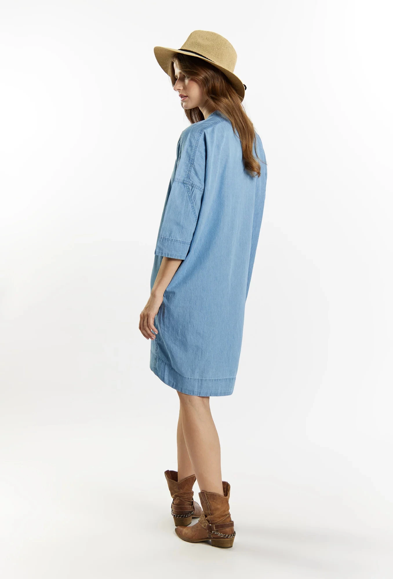 Dámské džínové šaty ležérního střihu. Šaty s 3/4 rukávy, výstřihem, stojáčkem s vázáním a zapuštěnými kapsami na bocích. Tento model se jistě osvědčí v letních dnech. Modelka na obrázku je 177 cm vysoká a má velikost 36.