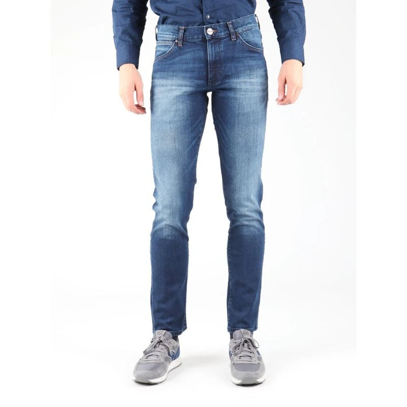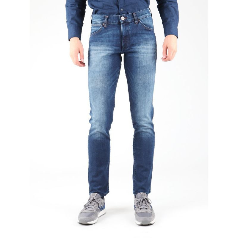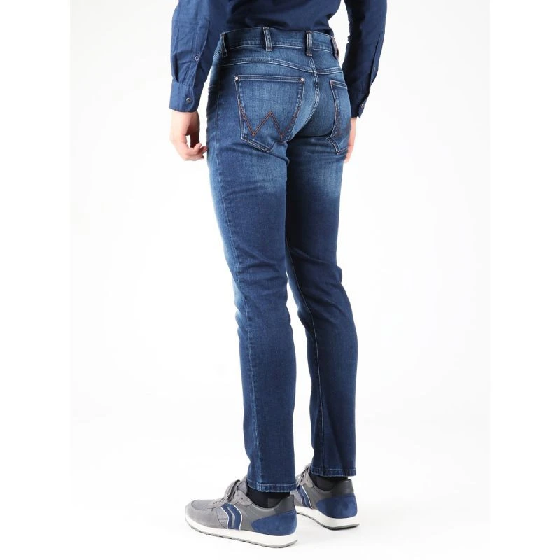 Pánské džíny s rovnými nohavicemi, regular střih, velké přední kapsy, kožená vsadka s logem Wrangler na zadním pásu.