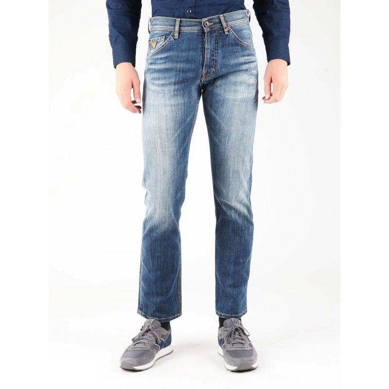 Pánské džíny s rovnou nohavicí a zapínáním na knoflíky. Velké kapsy na přední i zadní straně. Kožené logo Guess na zadním pásu.