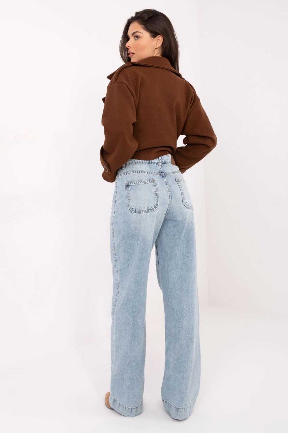 Dámské kalhoty s širokými nohavicemi vyrobené z bavlny jsou ideální volbou na každodenní nošení v ležérním stylu. Hladký materiál a klasický džínový charakter umožňují snadno kombinovat s oblíbenými základními kousky a trendy doplňky. Vysoký pas zdůrazňuje pas a poskytuje pohodlí při nošení, zatímco široké nohavice dodávají siluetě lehkost a moderní vzhled. Model se zapínáním na zip a knoflík je vybaven praktickými kapsami, jak vpředu, tak vzadu.