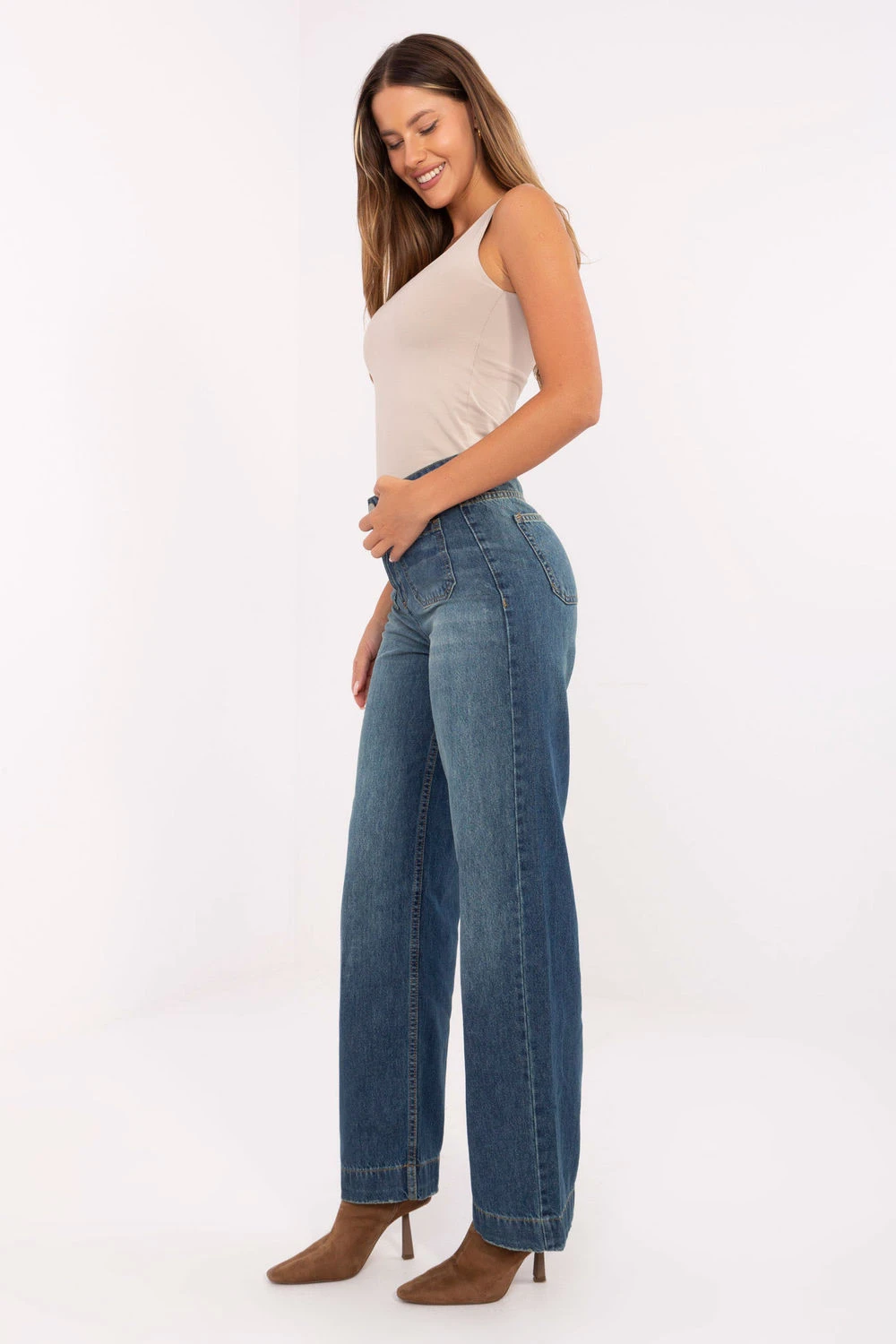 Dámské džíny relaxed fit v casual stylu, ideální pro každodenní a volné outfit. Vyrobené z vysoce kvalitní bavlny, poskytují pohodlí a pohodlí při nošení. Model s vysokým pasem a rovnými nohavicemi klasicky padne na postavu. Vepředu má našité kapsy místo standardních vložených a vzadu otevřené kapsy. Zapínání na zip a knoflík doplňuje celkový vzhled, hladký denim umožňuje snadné zkombinování džín s různými kusy oblečení.