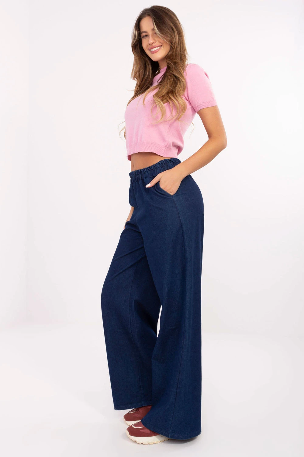 Pohodlné a trendy dámské džíny wide leg ve volném, casualovém střihu, ideální na každodenní outfit. Vyrobené z vysoké kvality směsi bavlny, polyesteru a elastanu, co zajišťuje odolnost, pružnost a pohodlí po celý den. Model má vysoký pas s gumou v pase, díky čemuž se skvěle přizpůsobuje postavě a zdůrazňuje pas, a široké nohavice wide leg dodávají kalhotám trendy, volný charakter. Boční kapsy zvyšují funkčnost a hladký vzor materiálu umožňuje snadné kombinování s různými outfity. Džíny nemají klasické zapínání, co zvyšuje pohodlí při oblékání a nošení. Jedná se o univerzální model, který se skvěle hodí jak do casualových, každodenních outfitů, tak do více stylových looků.