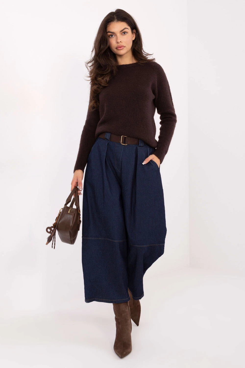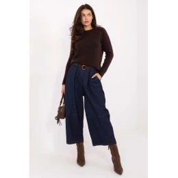 Volné dámské kalhoty typu kuloty, ideální pro každodenní outfit. Vyrobené z kombinace bavlny a elastanu, poskytují pohodlí, volnost pohybu a lehkou pružnost. Hladký materiál zdůrazňuje univerzální charakter modelu, díky čemuž lze kalhoty snadno sladit s mnoha outfitovými styly. Model má vysoký pas a vzadu je do pasu vsazena guma, která zvyšuje pohodlí nošení a umožňuje ideální přizpůsobení. Součástí je přezka na opasek, která navíc zdůrazní pas. Široké nohavice charakteristické pro střih kuloty dodávají kalhotám módní a volný styl. Kalhoty nemají klasické zapínání, což zvyšuje pohodlí nošení. Jsou vybaveny bočními kapsami, které dodávají praktičnost do každodenního života. Je to ideální volba pro ženy, které ocení pohodlí, módní střih a ležérní, městský styl.