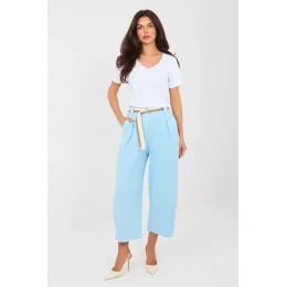 Moderní dámské džíny typu wide leg, které spojují pohodlí s moderním stylem. Vyrobené z vysoce kvalitní bavlny s přídavkem elastanu, zaručují pohodlí při nošení a volnost pohybu po celý den. Model má vysoký pas a vsazený gumový pásek, díky čemuž se dokonale přizpůsobuje postavě bez nutnosti zapínání. Záhyby na přední straně dodávají eleganci a opticky prodlužují nohy. Široké nohavice zdůrazňují moderní charakter kalhot a zajišťují lehkost stylizace. Kalhoty jsou vybaveny bočními vloženými kapsami a zapínacím páskem, který je praktickým a stylovým doplňkem. Hladký vzor zaručuje, že se model skvěle hodí jak do každodenních stylizací, tak do práce v casualovém provedení. Univerzální, pohodlné a stylové - ideální základ pro mnoho outfitů.