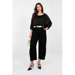 Moderní dámské džíny typu wide leg, které spojují pohodlí s moderním stylem. Vyrobené z vysoce kvalitní bavlny s přídavkem elastanu, zaručují pohodlí nošení a volnost pohybu po celý den. Model má vysoký pas a vsazený gumový pásek, díky čemuž se ideálně přizpůsobuje postavě bez nutnosti zapínání. Záhyby na přední straně přidávají eleganci a opticky zúžují nohy. Široké nohavice zdůrazňují módní charakter kalhot a zajistí lehkost stylizace. Kalhoty jsou vybaveny bočními kapsami a zapínacím páskem, který je praktickým a stylovým doplňkem. Hladký vzor zajišťuje, že se model skvěle hodí jak do každodenních stylizací, tak do práce v casualovém provedení. Univerzální, pohodlné a stylové, ideální základ pro mnoho outfitů.