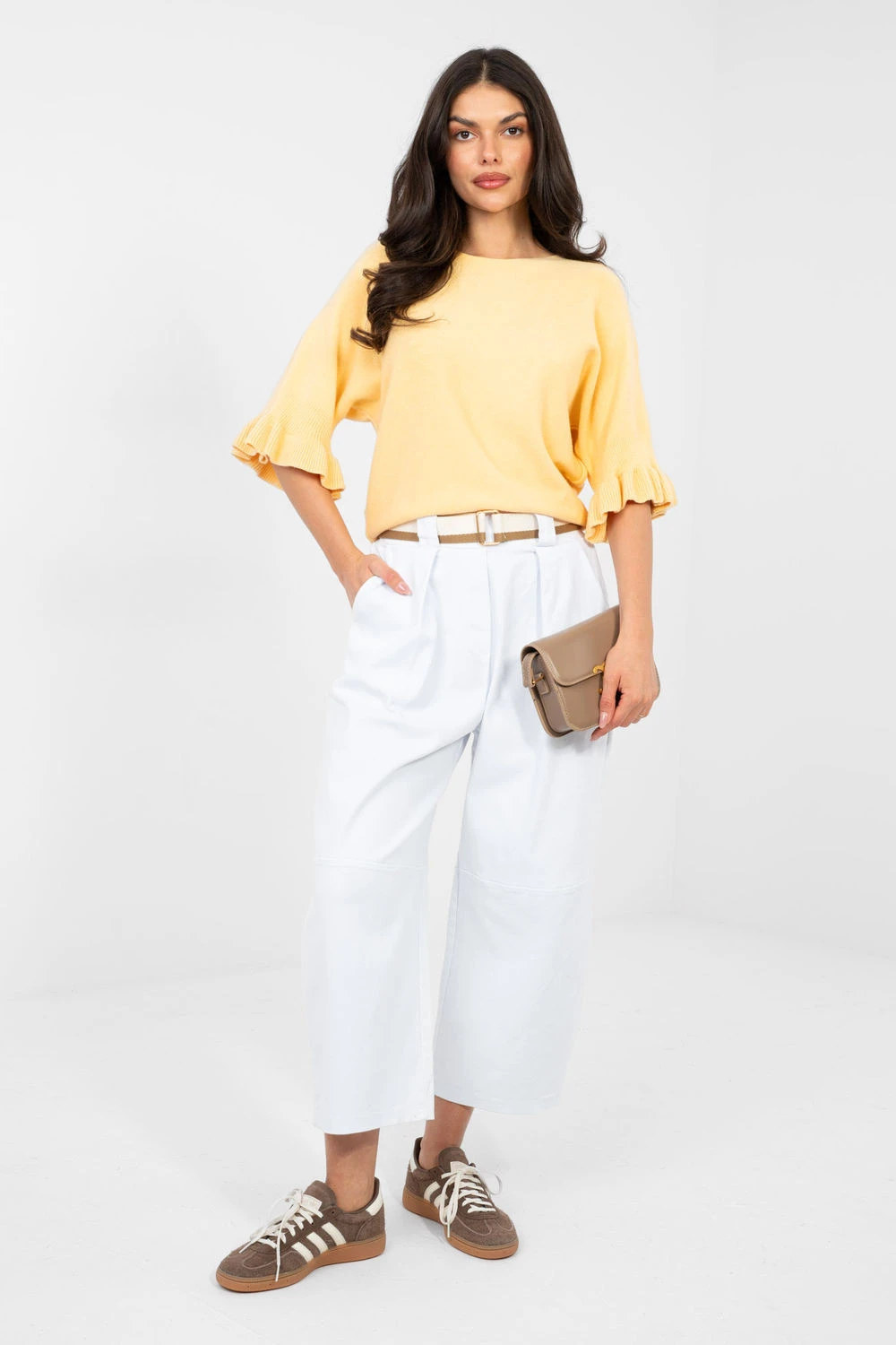 Moderní dámské džínové kalhoty typu wide leg, které spojují pohodlí s moderním stylem. Vyrobené z vysoce kvalitní bavlny s přídavkem elastanu, zaručují pohodlí nošení a volnost pohybů po celý den. Model má vysoký pas a vsazenou gumu v pase, díky čemuž se ideálně přizpůsobuje postavě bez nutnosti zapínání. Záložky na přední straně přidávají eleganci a opticky zúžují nohy. Široké nohavice zdůrazňují módní charakter kalhot a zajišťují lehkost stylizace. Kalhoty jsou vybaveny bočními kapsami na zip a zapínacím páskem, který je praktickým a stylovým doplňkem. Hladký vzor zaručuje, že model bude skvěle vypadat jak v každodenních stylizacích, tak i při práci v casualovém provedení. Univerzální, pohodlné a stylové, ideální základ pro mnoho outfitů.