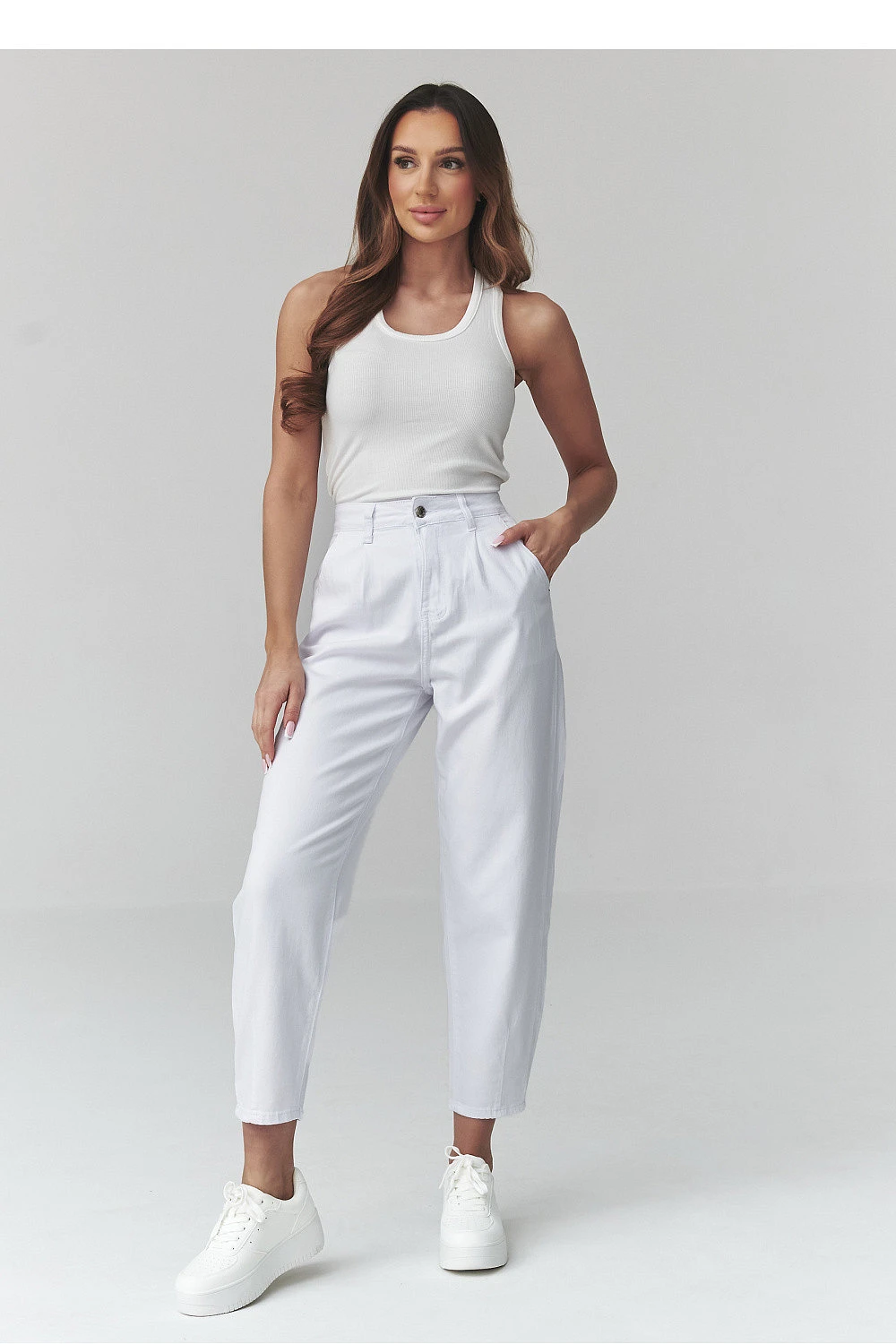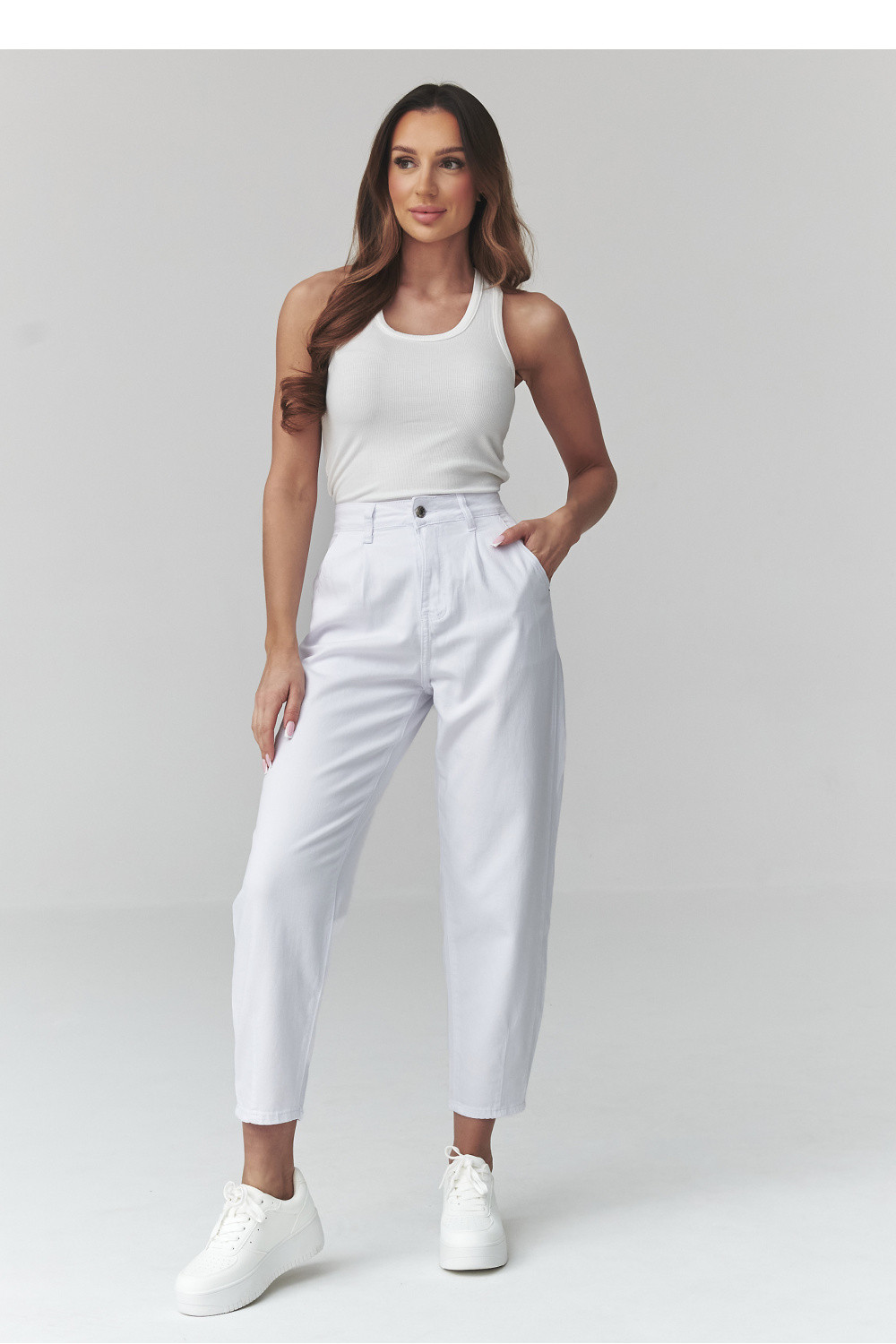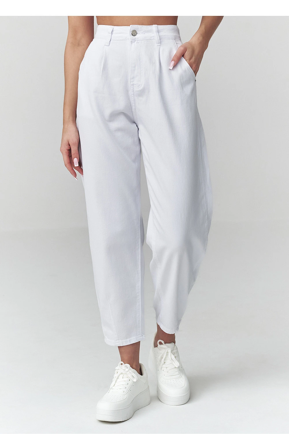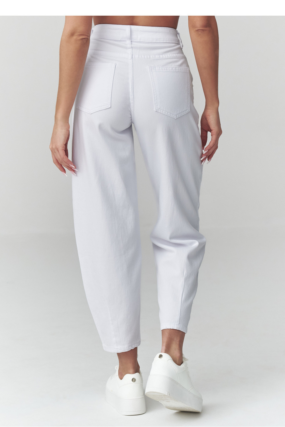 Vsadíme na nadčasový pohodlí a volnost! Džíny s vysokým pasem typu mom fit jsou must have každé ženy, která miluje módní, ale pohodlné outfity. Nohavice se lehce zužující ke spodní části skvěle ladí s teniskami, keckami nebo kotníčkovými botami. Kalhoty skvěle vypadají jak ve spojení s tričkem a bundou, tak s elegantní košilí ideální na každý den, do práce a na setkání s přáteli. Model je vyroben z měkkého, tenkého džínového materiálu s prodyšnou strukturou. Vyrobeno v Itálii.