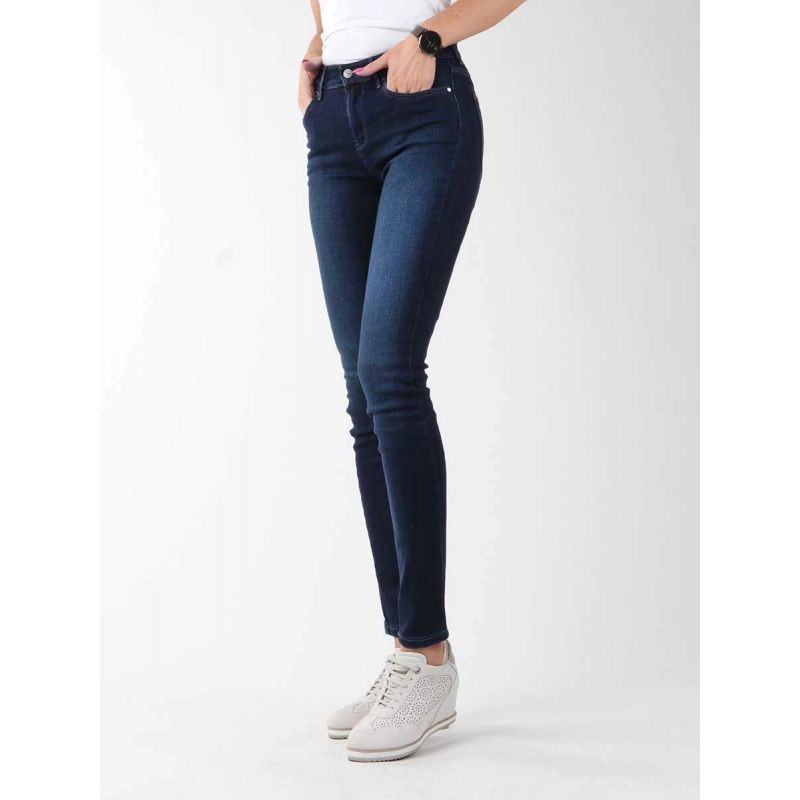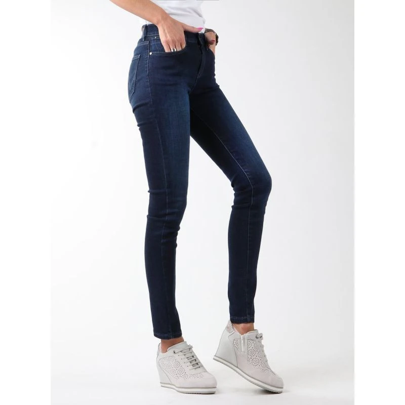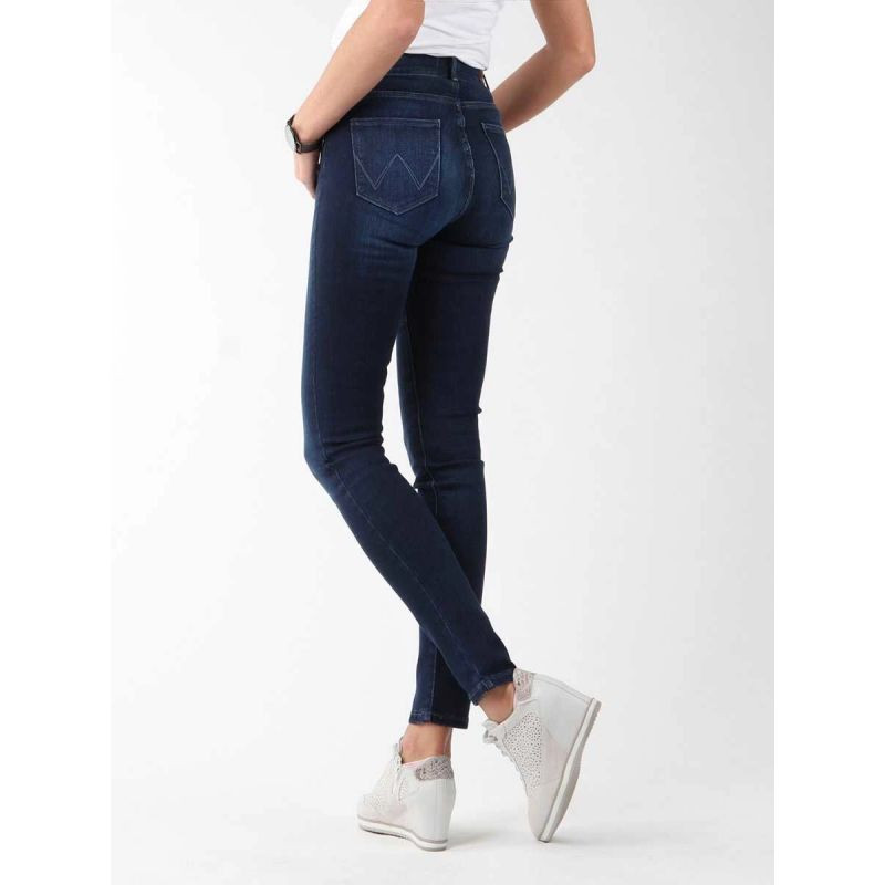 Přiléhavé džíny s vysokým sedem a zúženými nohavicemi. Malé kapsy vpředu a vzadu. Logo Wrangler na zadní straně.