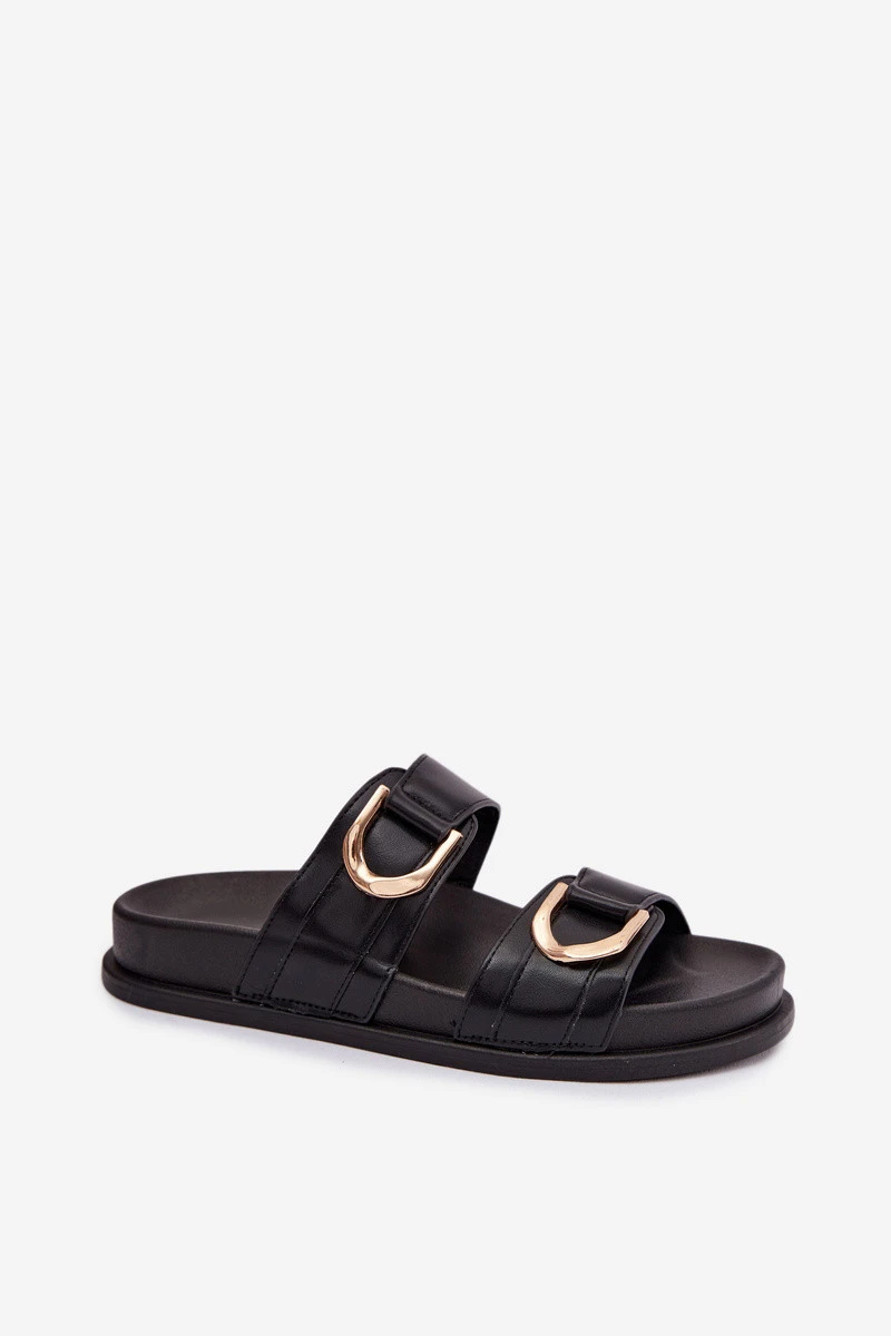 Stylové dámské nazouváky z eko kůže jsou pohodlnou volbou na teplé dny. Model na jemné platformě zajišťuje komfort nošení a jemně zvýrazňuje siluetu. Dva přední pásky, ozdobené zlatými prvky, dodávají celku elegantní charakter a módní akcent. Tyto nazouváky se skvěle hodí do každodenních letních outfitů. Při výběru velikosti se řiďte tabulkou velikostí.