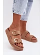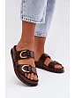 Stylové dámské nazouváky z eko kůže jsou pohodlnou volbou na teplé dny. Model na jemné platformě zajišťuje komfort nošení a jemně zvýrazňuje siluetu. Dva přední pásky, ozdobené zlatými prvky, dodávají celku elegantní charakter a módní akcent. Tyto nazouváky se skvěle hodí do každodenních letních outfitů. Při výběru velikosti se řiďte tabulkou velikostí.