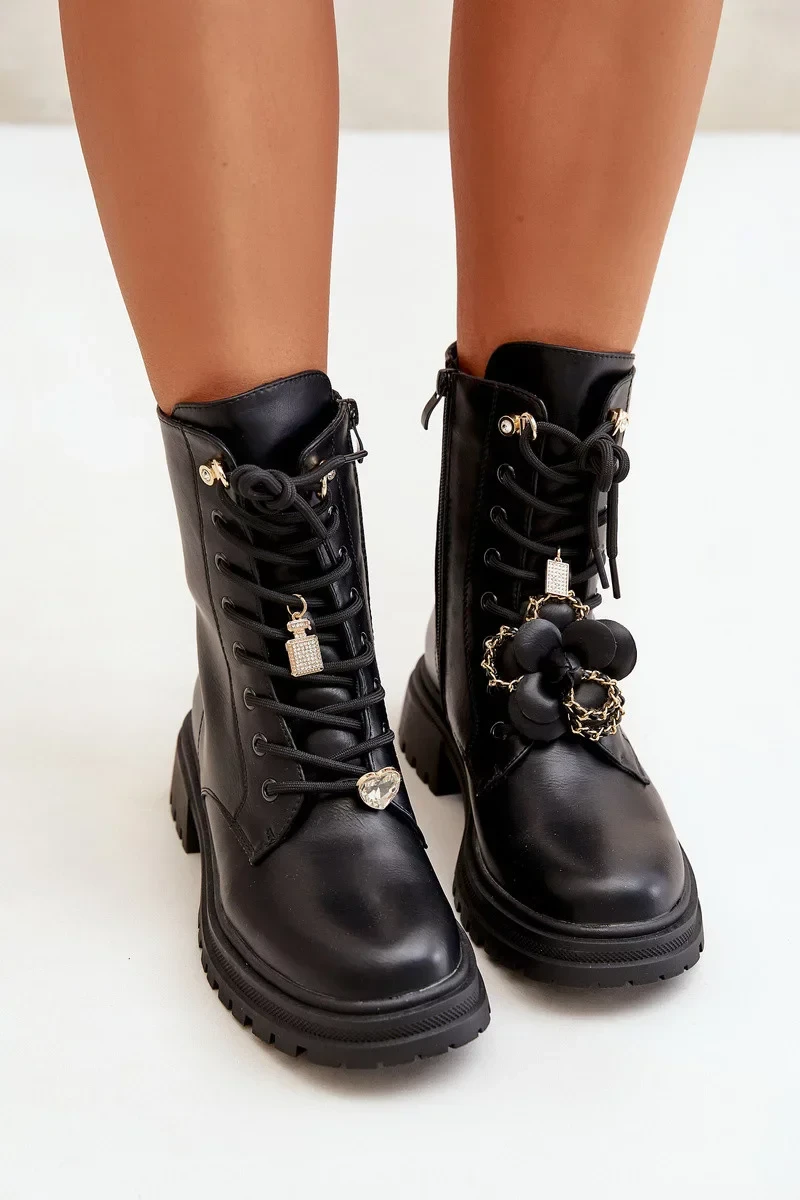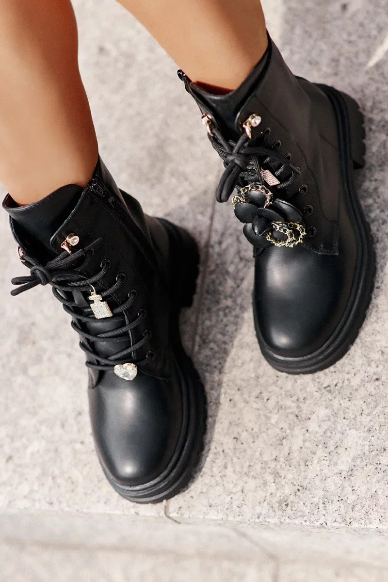 Osazené na plochém podpatku. Zaoblené špičky. Zapínání na zip z boku pro snadné oblékání a dodatečné šněrování s roztomilými ozdobami jim dodává výjimečné kouzlo. Ideální na podzimní a zimní stylizace, skvěle se hodí k různým outfitům na chladnější dny. Při výběru velikosti se prosím řiďte tabulkou velikostí.36-23,5/37-24/38-24,5/39-25,5/40-26/41-26,5 cm