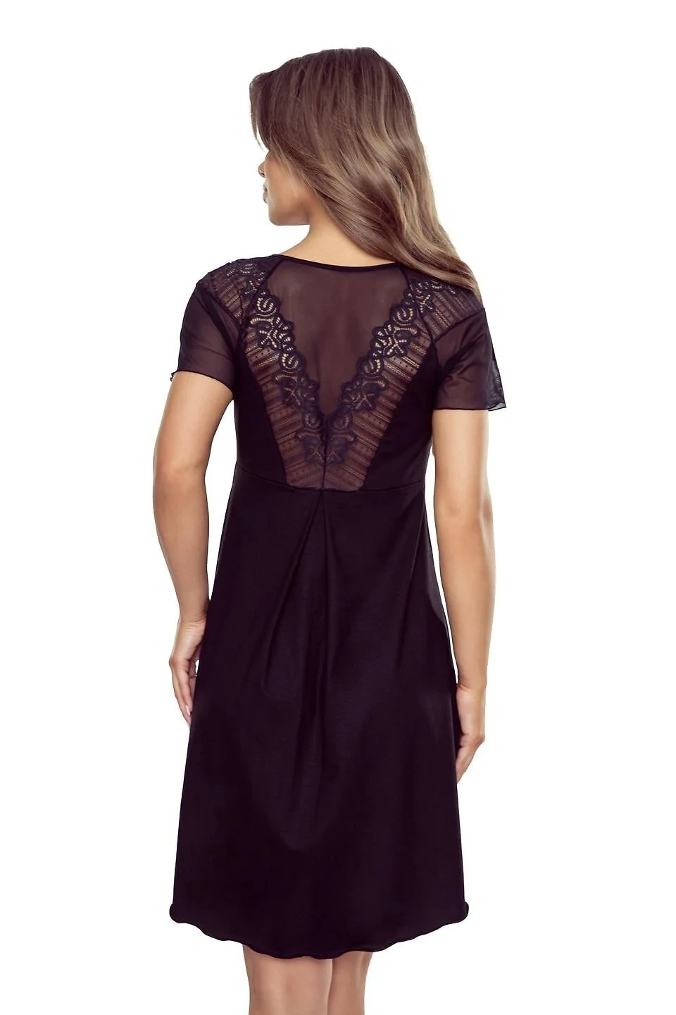 - výstřih a rukávy z prolamované krajky