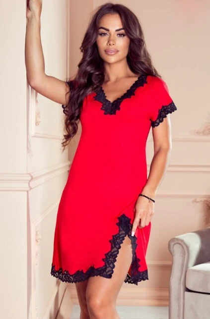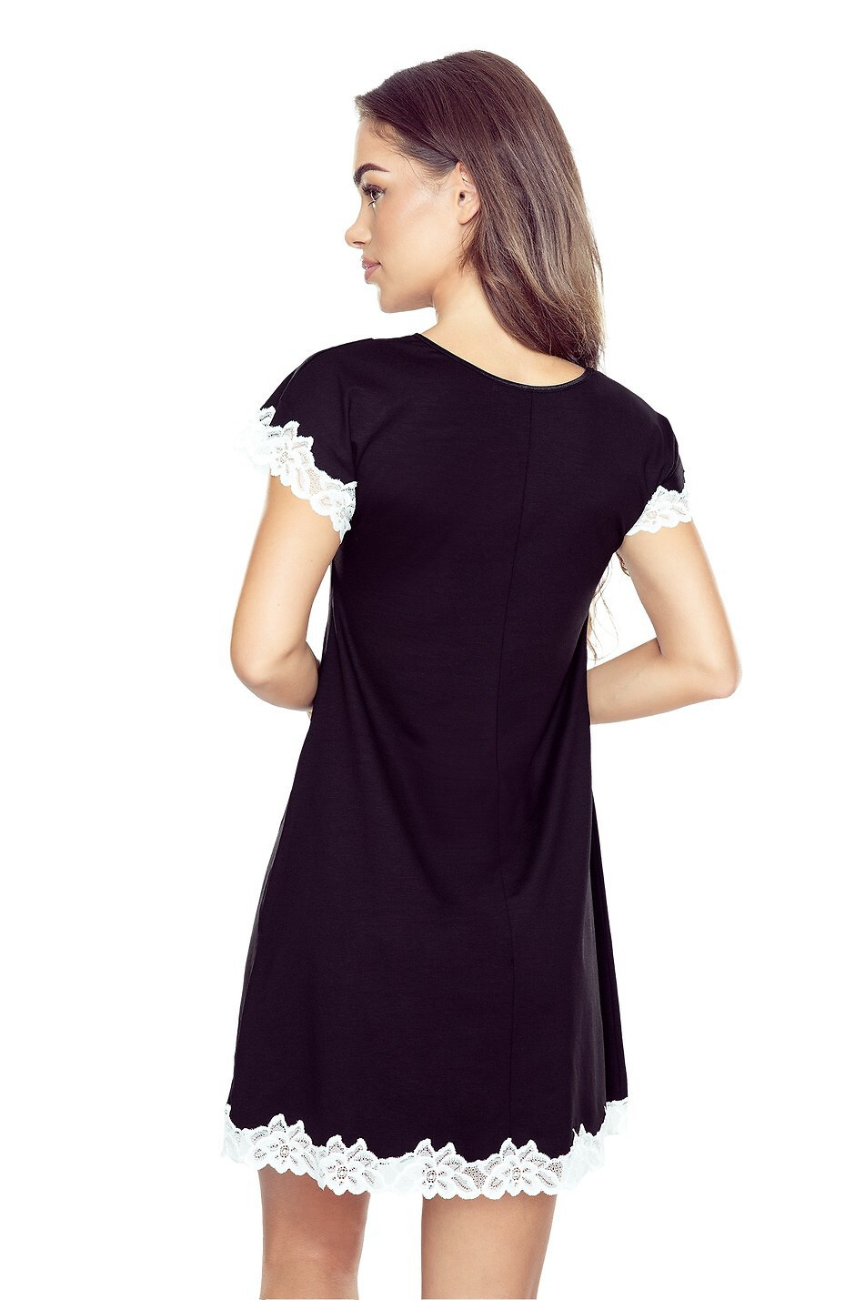 - výstřih, rukávy a rozparek z krajky s květinovým vzorem
