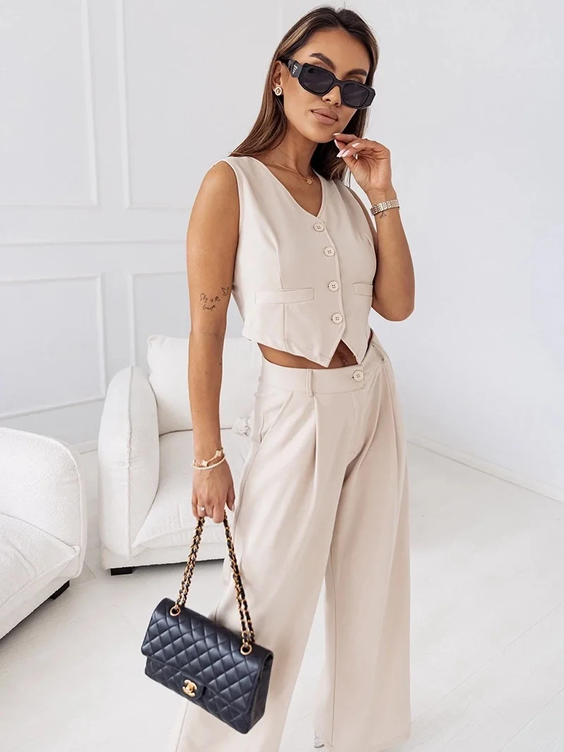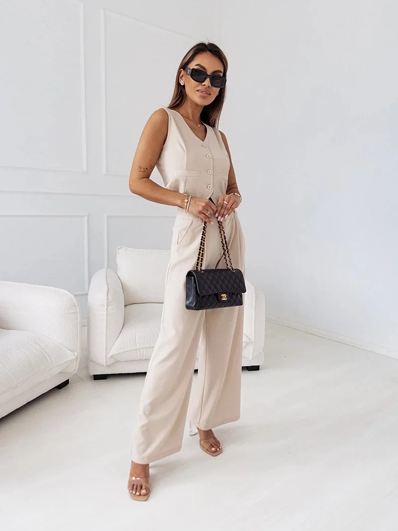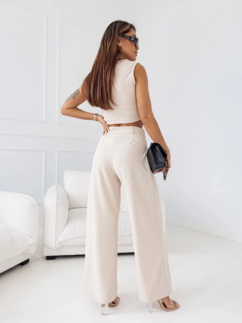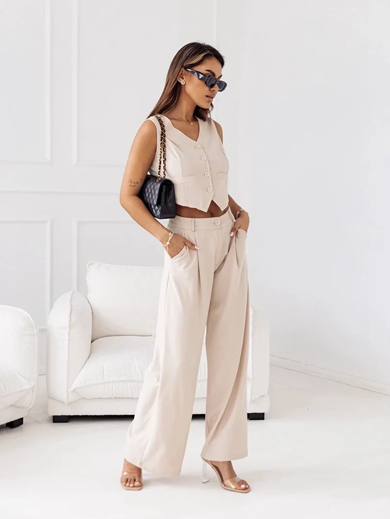 Elegantní béžový dámský komplet - krátká vesta a široké kalhoty (VE90)