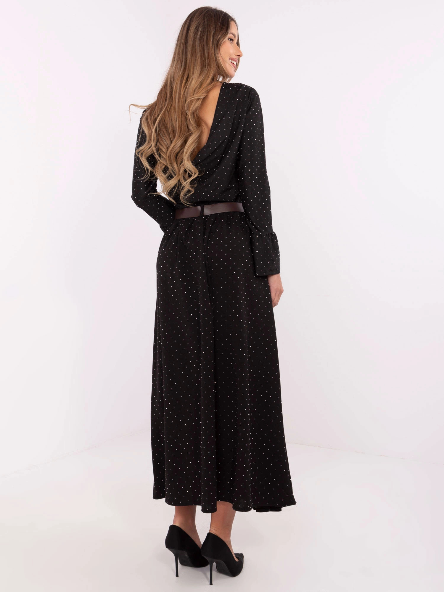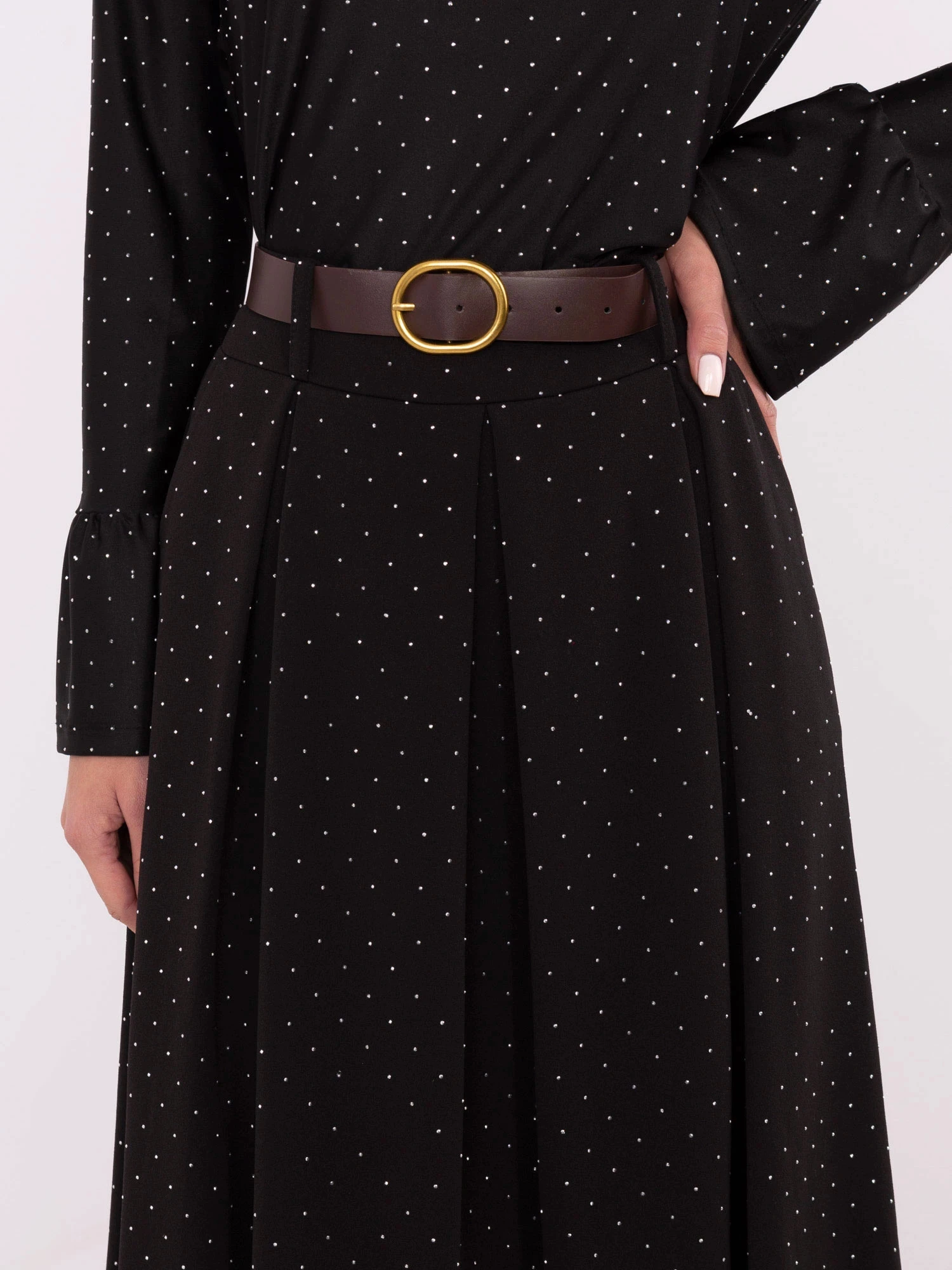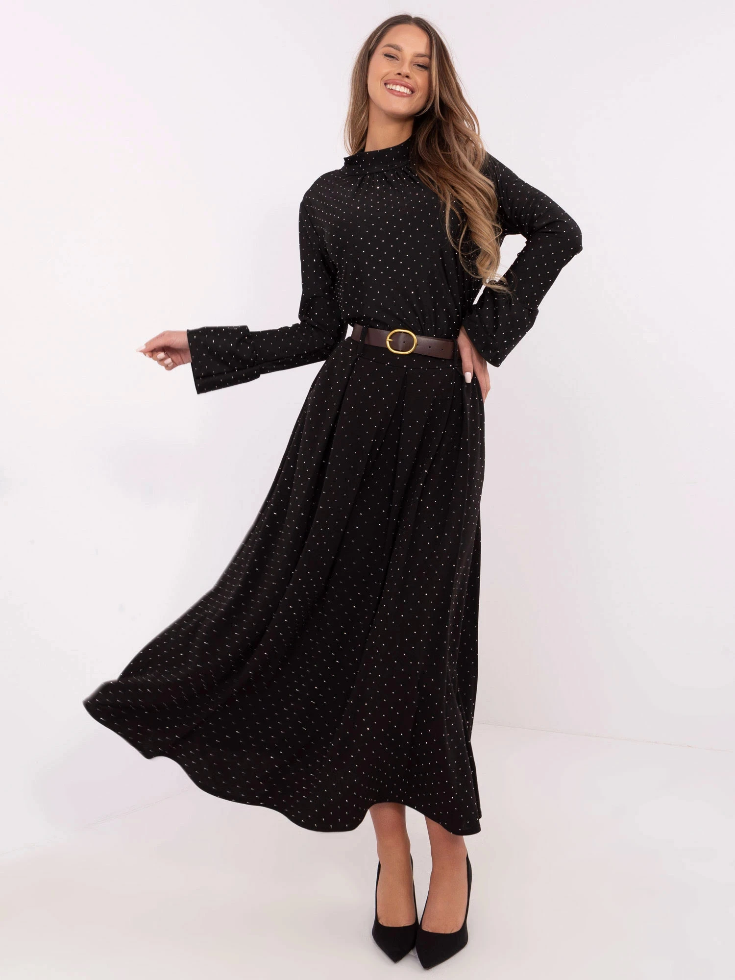 Sukně má v pase gumu a je doplněná opaskem. Model má délku ke kotníkům.