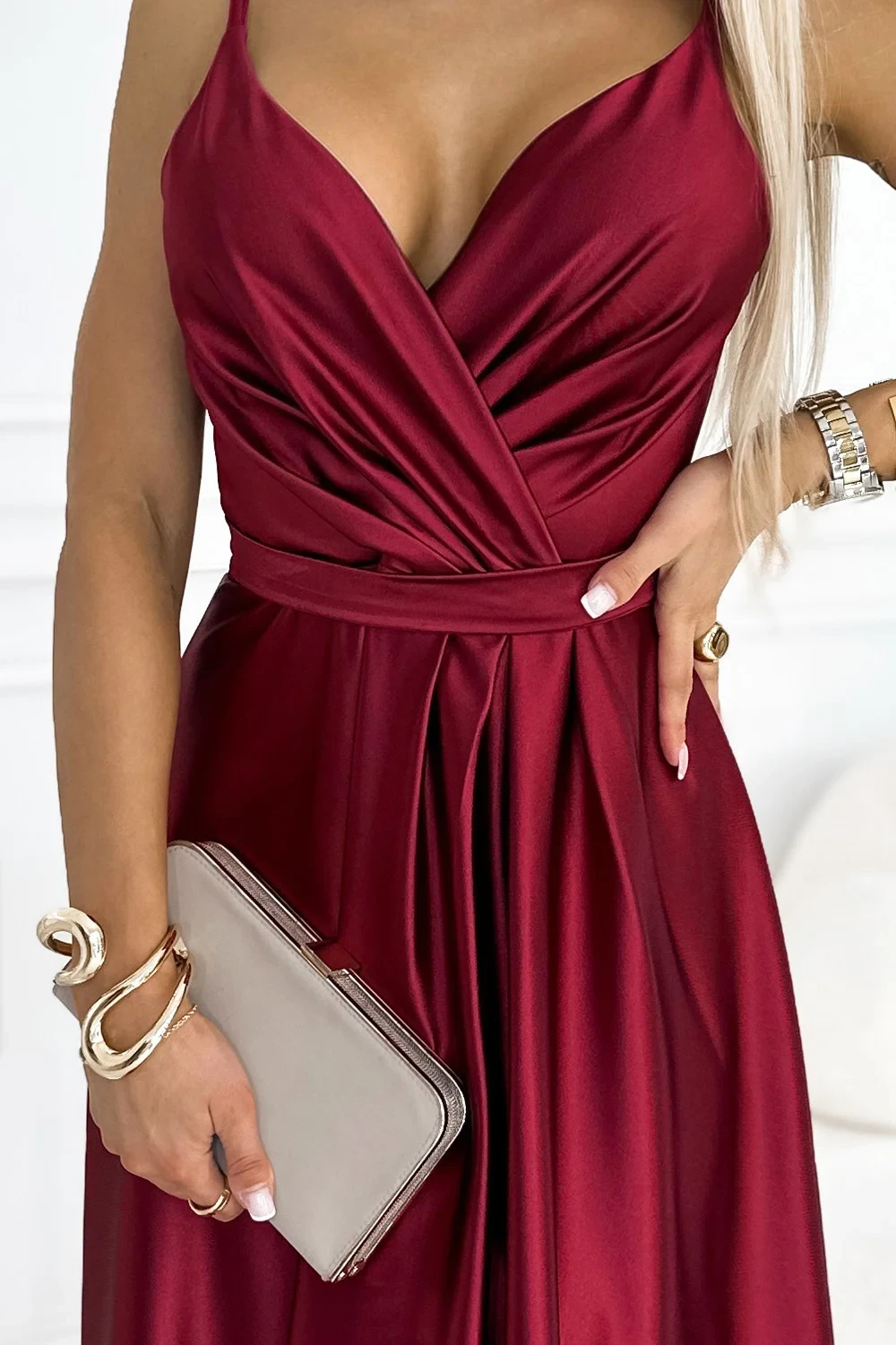 Elegantní dlouhé dámské saténové šaty ve vínové bordó barvě s výstřihem a rozparkem na noze model 19516845 - numoco