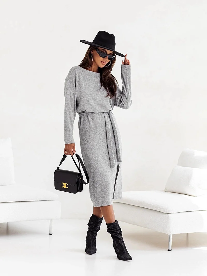 Přidání recenze k Elegantní šedé dámské midi šaty s páskem (82137)