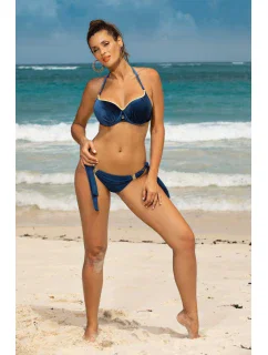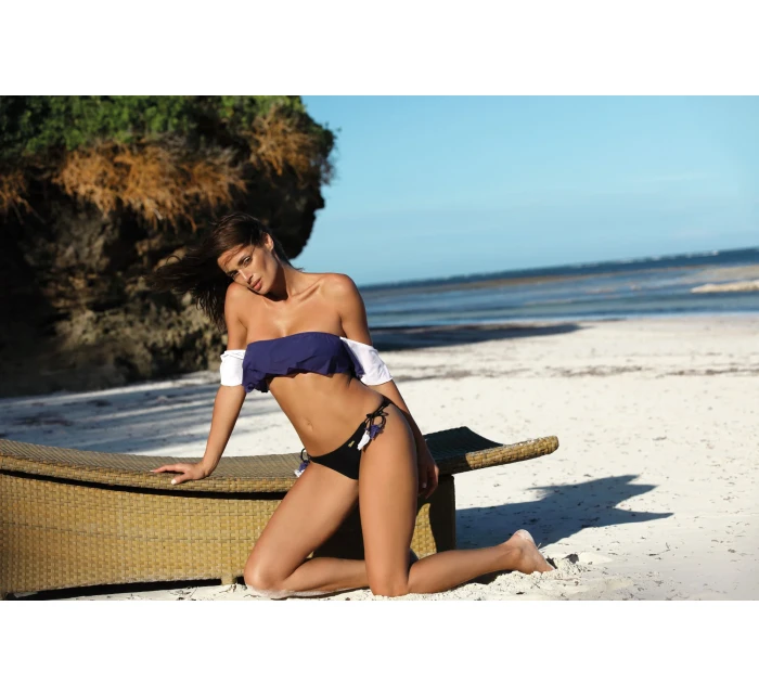 Horní díl tvoří vzdušný top s krátkými rukávy, pohodlně zavazovaný na zádech. Střih bez push-up a bez podvazků umožňuje maximálně krásný, přirozený dekolt. Spodní díl - hladké, na boku zavazované kalhotky se střapci. Model je k dispozici v mnoha atraktivních barvách, ze kterých si můžete vybrat. Vysoce kvalitní italská tkanina. Složení: 80 % polyamid, 20 % elastan.