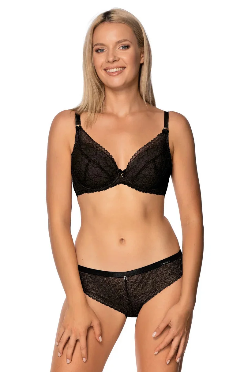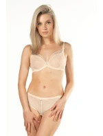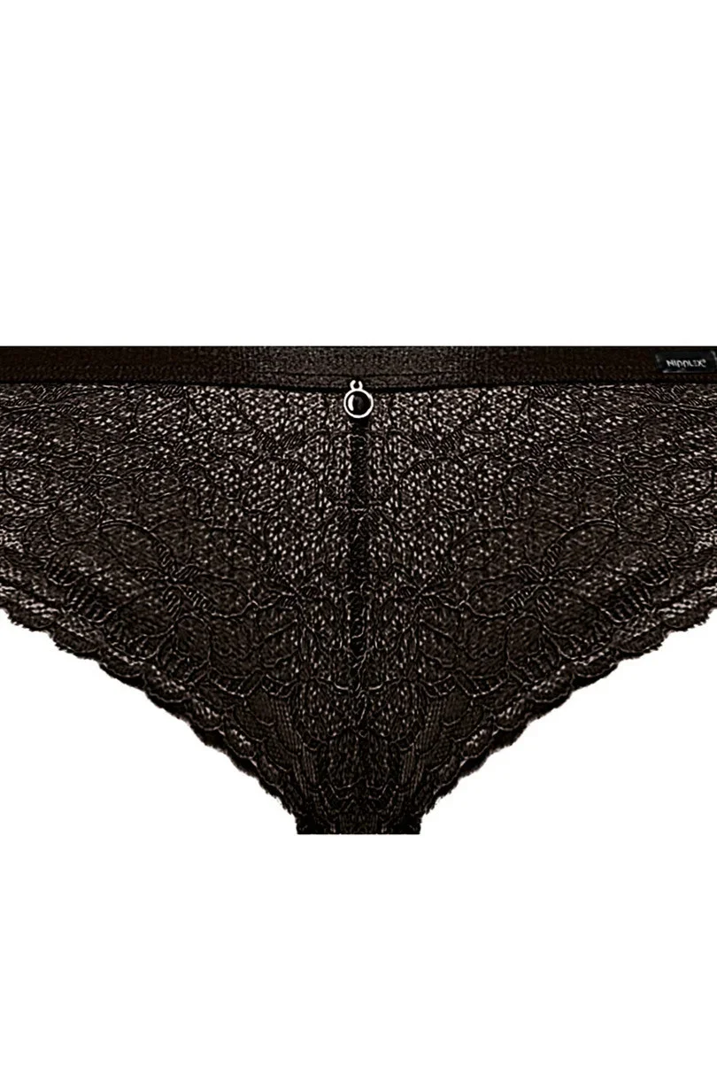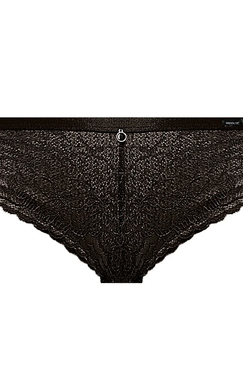 Dámské bikiny brazilského střihu jsou ušité z ažurové krajky. Přední díl je podšitý síťovinou a v pase má plochou gumu a ozdobný šperk
