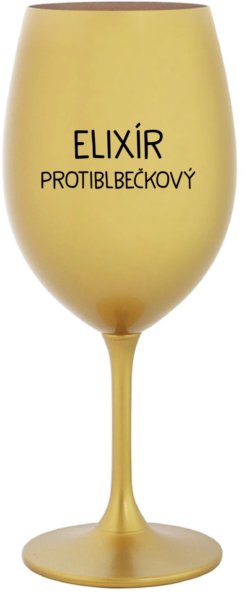 Vinná zlatá sklenice s originálním motivem ELIXÍR PROTIBLBEČKOVÝ je krásným a osobitým dárkem, které ale využijete i Vy sami třeba ve chvílích, kdy si budete chtít zpříjemnit náročný den. Tyto originální vinné sklenice jsou totiž nejen pro výjimečné události, ale i pro běžné večery, které si chcete zpříjemnit sklenkou dobrého vína. Jistě proto potěší každého milovníka vína, i toho, kdo si umí svůj život vychutnat plnými doušky.