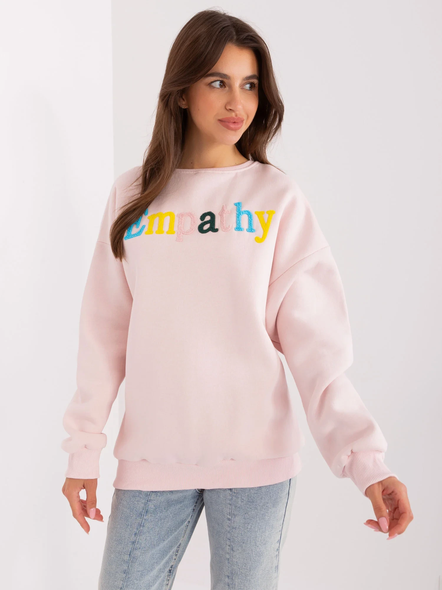 Světle růžová mikina oversize střihu bez kapuce .