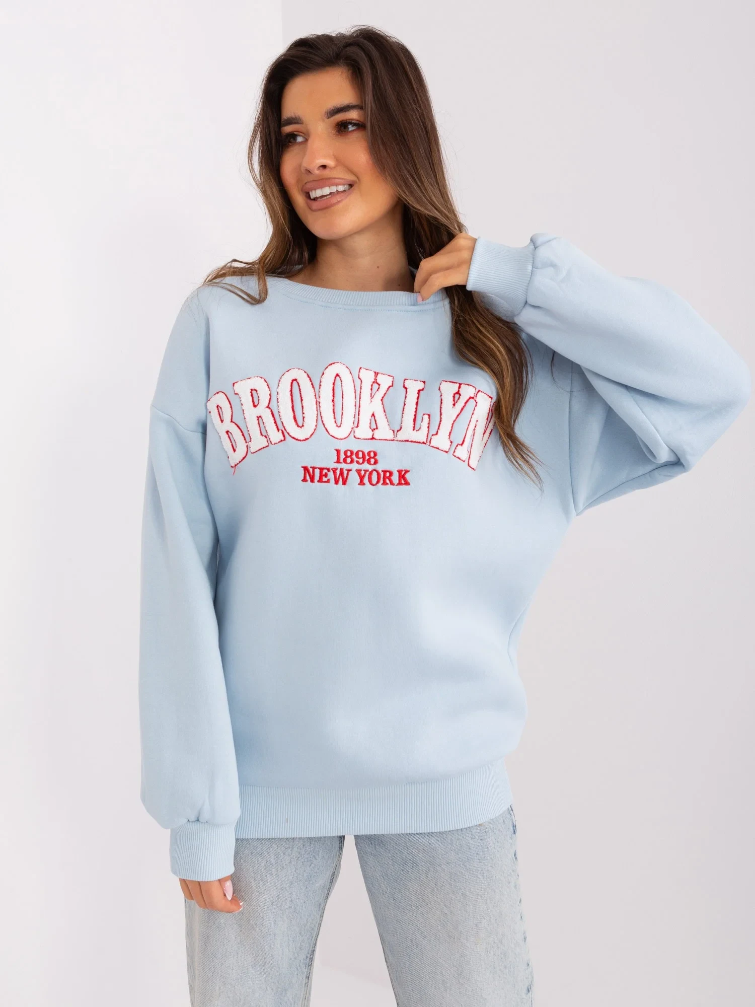 Světle modrá mikina oversize střihu bez kapuce .