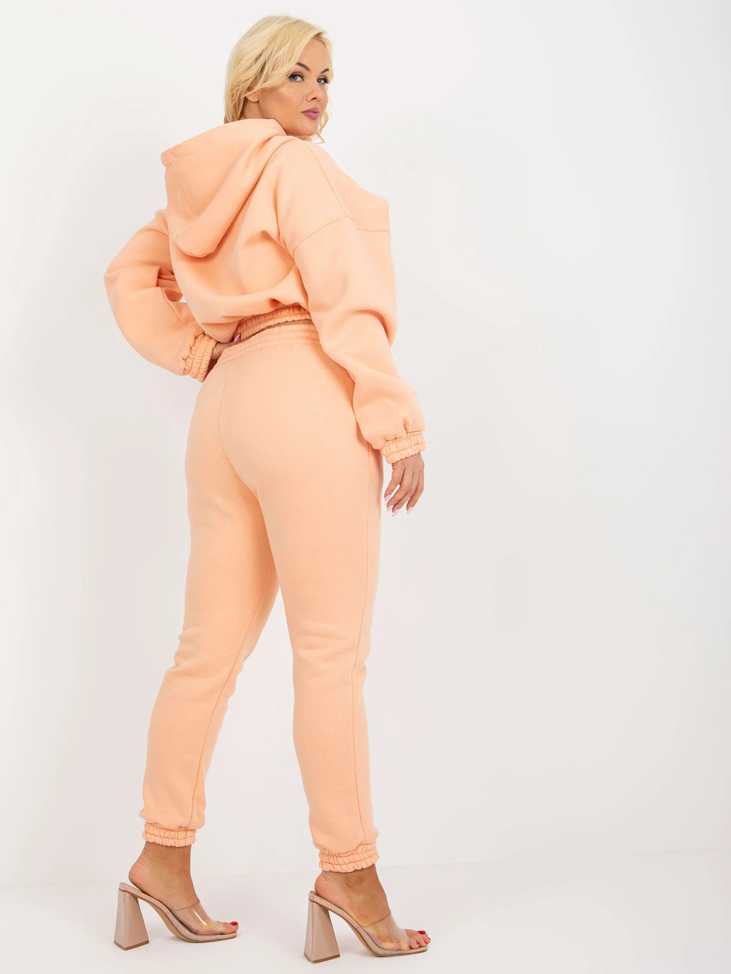 Modelka má na sobě velikost L. Rozměry modelky: výška 172 cm, prsa 103 cm, pas 73 cm, boky 103 cm.