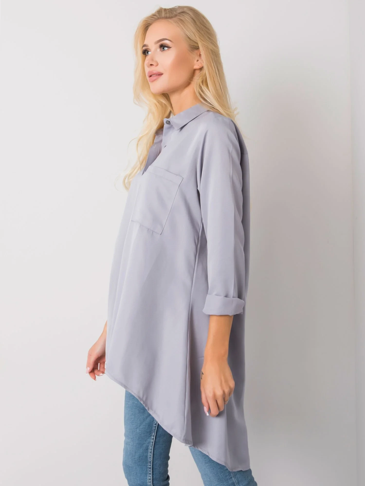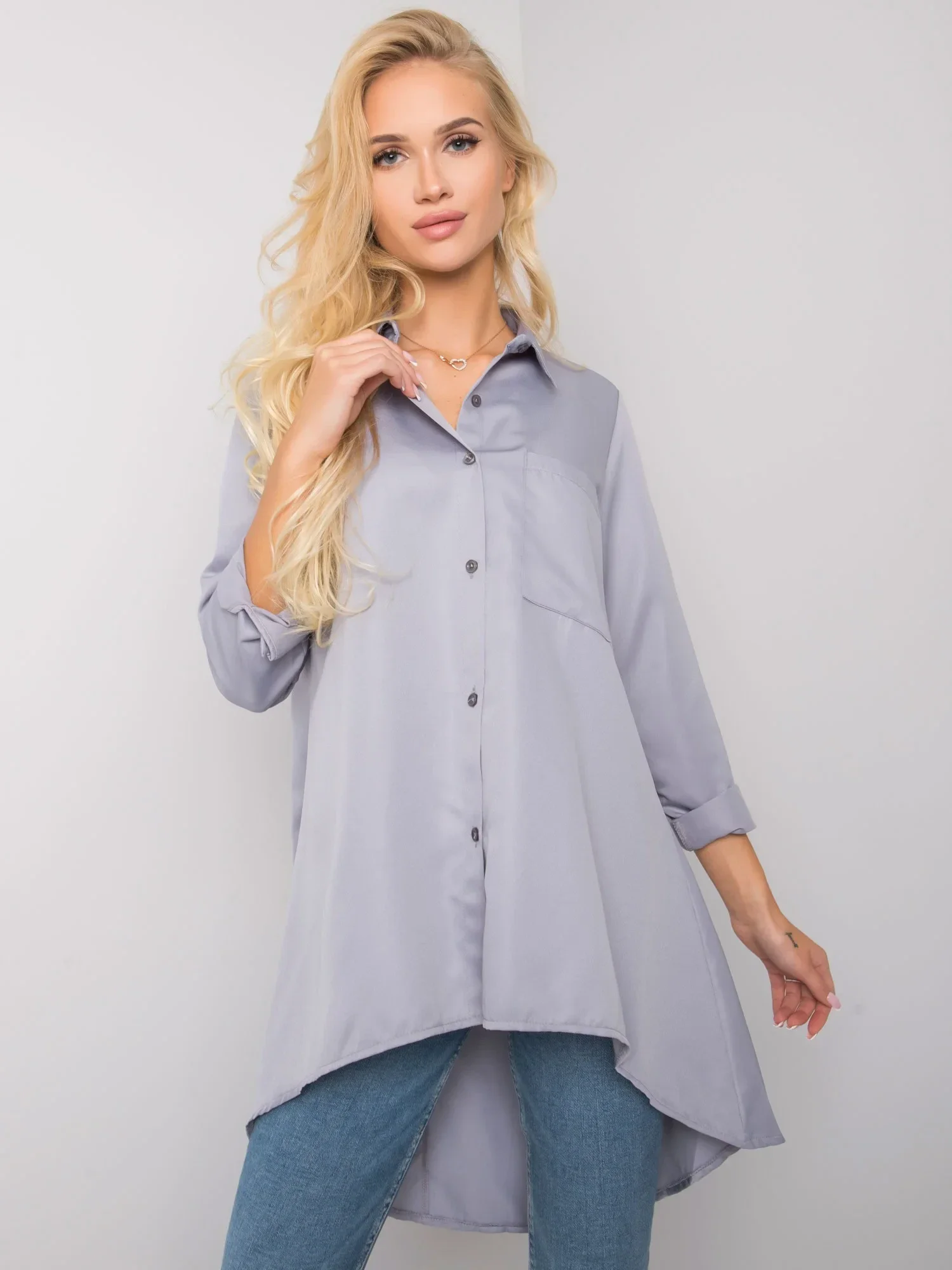 Šedá košile s delšími zády.