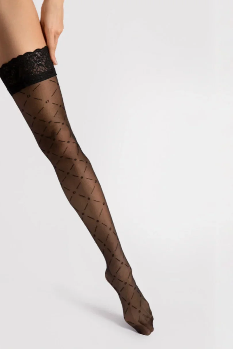 Samodržící punčochy 20 den. Jemný vzor a ozdobná gumová podšívka.