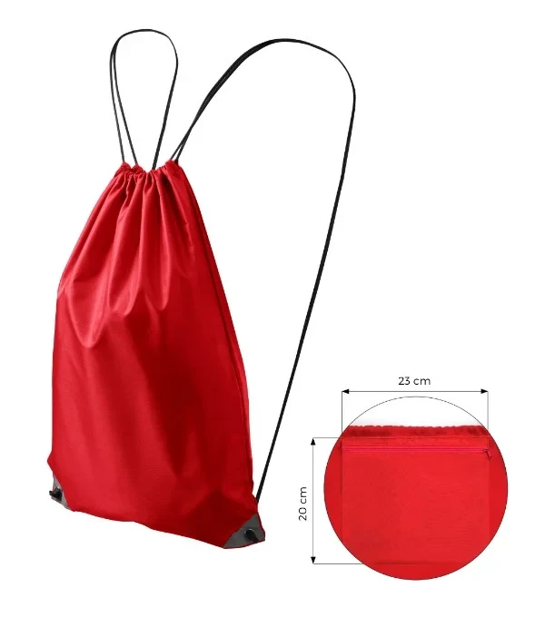 zavírání na stahování 2 polyesterové šňůrky v barvě 01 reflexní prvky v dolních rozích vnitřní kapsa na zip 20 x 23 cm rozměry batohu 45 x 34 cm