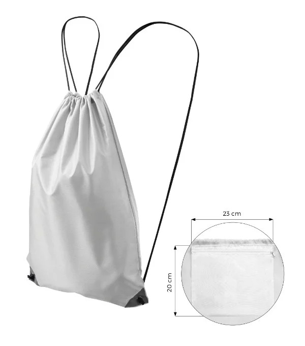 zavírání na stahování 2 polyesterové šňůrky v barvě 01 reflexní prvky v dolních rozích vnitřní kapsa na zip 20 x 23 cm rozměry batohu 45 x 34 cm
