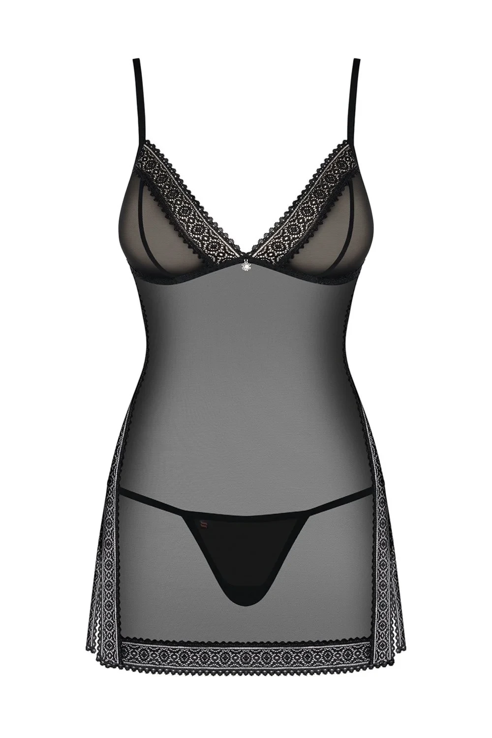 Dámská erotická košilka 862-CHE OBSESSIVE - černá barva - sexy, černá košilka - průsvitná síťovina s krajkovými lemy - nastavitelné ramínka - možnost přizpůsobení - mírně vyztužené košíčky jemně podpírají poprsí - béžové utajené výztuže - prsa jsou zakryta a zároveň perfektně zvýrazněna - krajkový dekor na výstřihu - květ s lesklým zirkonem - mimořádně ženský doplněk - lákavé rozparky na bocích - sada obsahuje košilku a tanga - příjemný a pružný materiál přizpůsobující se těluMateriálové složení: 94% polyamid + 6% elastan