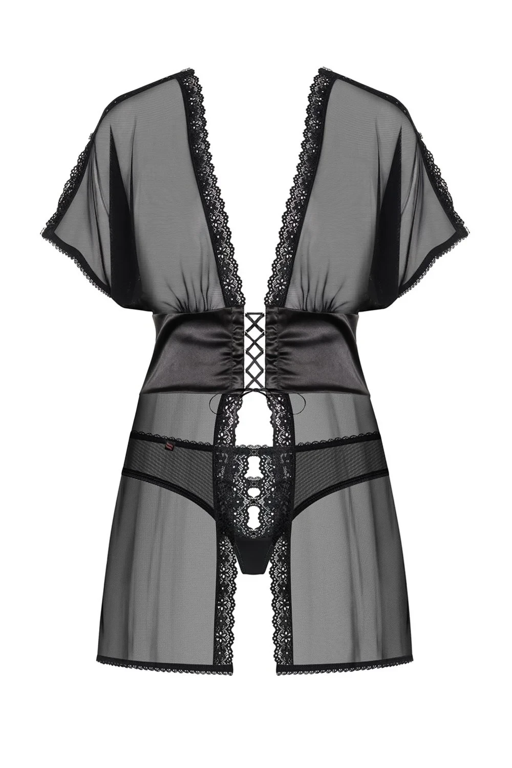 Erotická košilka 868-BAB Obsessive - z průsvitné síťoviny - svůdné průstřihy na rukávech - obnažená ramena - elegantní ozdoba s černými bižu šperky - šest krásných detailů na ramenou - šněrování pod bustou - krásná, saténová tkanina spojuje horní a spodní část - okraje lemováné krajkou - zajímavé otvory na bocích - souprava osahuje kosilku a kalhotkyMateriálové složení: 94% polyamid + 6% elastan