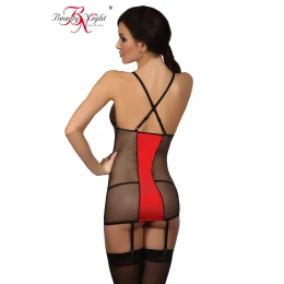 Svůdná košilka Heather chemise Beauty night z průhledného síťovaného materiálu, ozdobeného červenou látkou. Košíčky jsou měkké bez kostic. Přední část košilky je otevřená. Ramínka jsou překřížená a délkově nastavitelná. Řemínky k punčochám nejsou odnímatelné a jsou regulovatelné. Tanga jsou součástí košilky. Produkt je balený v dárkovém pytlíčku, který je ideální pro skladování. V elegantní krabičce s obrázkem zboží, které je uvnitř balení a s logem Beauty Night.