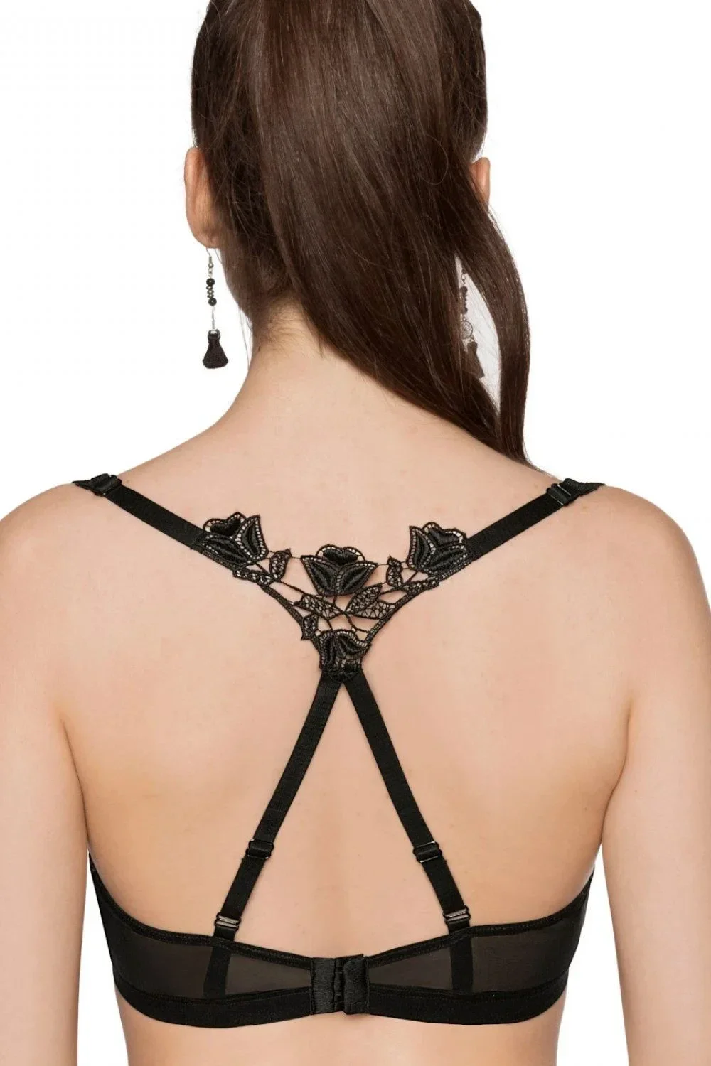 Erotická podprsenka Lisbet ROZA - černá barva - typ braletka - vyrobená z elastického tylu - přední část zdobená nášivkami - zadní část zdobená krajkovou vsadkou, kterou lze odepnout - možnost vyměnit za jednoduchá odepínatelná ramínka, která jsou součástíMateriálové složení: 75% polyamid + 20% elastan + 5% bavlna