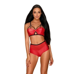 Dámská erotická souprava Leatheria set red OBSESSIVE - červená barva - smyslné pásky lemující poprsí - nastavitelné popruhy - nastavitelné zapínání na zadní straně - lehce polstrovaná podprsenka s kosticemi - dokonale zvýrazněná prsa - skvostný detail mezi košíčky podprsenky - vysoké kalhotky se šněrováním - výřez pod poprsím - pikantní detail - krásný a odolný materiál