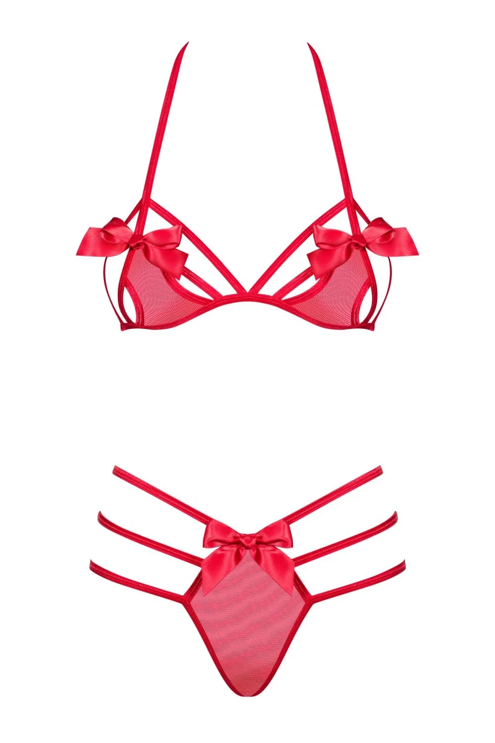Sexy souprava Giftella set Obsessive - zcela jedinečná dvoudílná sada - podprsenka svázaná kolem krku a zad - tanga s trojitým pruhem - košíčky vyrobené z pásků - odvážně odkryté poprsí - tři ozdobné, koketní mašličky - podprsenka a tanga - sada neobsahuje punčochy - jemná síťovina a elastické páskyMateriálové složení: 94% polyamid + 6% elastan